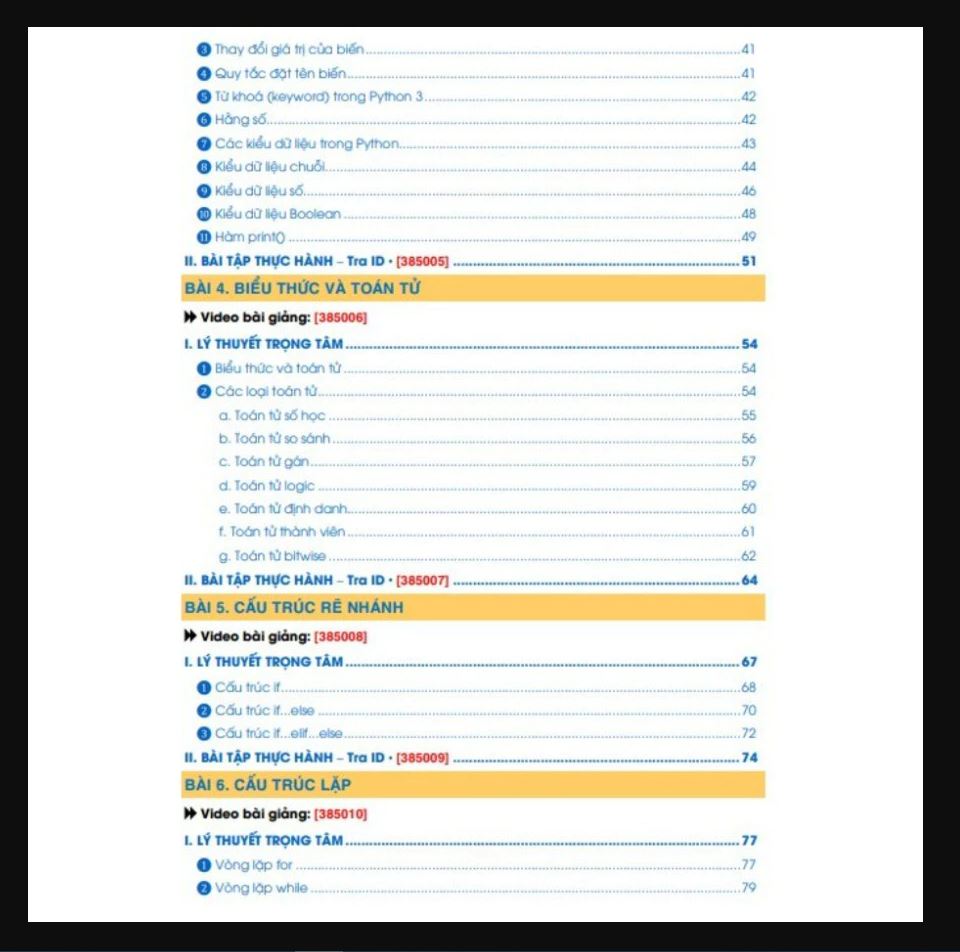 Gồm 15 bài học và 2 dự án thực hành. + Bài 1: Cài đặt môi trường phát triển + Bài 2: Ngôn ngữ lập trình Python + Bài 3: Biến và kiểu dự liệu