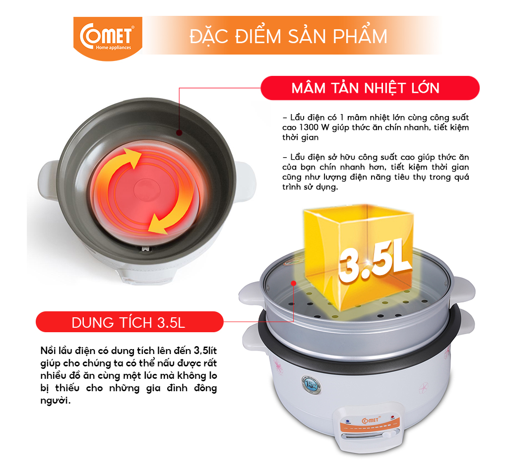 Nồi lẩu điện Comet CM7732 3.5 lít có xửng hấp | shopthuan