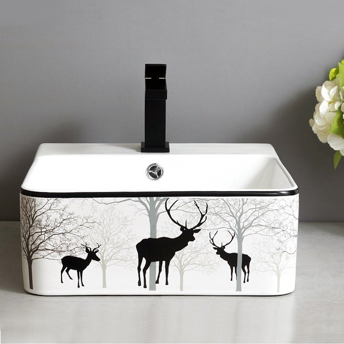 Kiểu dáng: bồn rửa mặt hươu sở hữu vóc dáng hình vuông , bề mặt trắng xen lẫn với các họa tiết nghệ thuật trang trí bắt mắt góp phần tôn thêm nét đẹp tinh tế, sang trọng cho không gian phòng tắm.