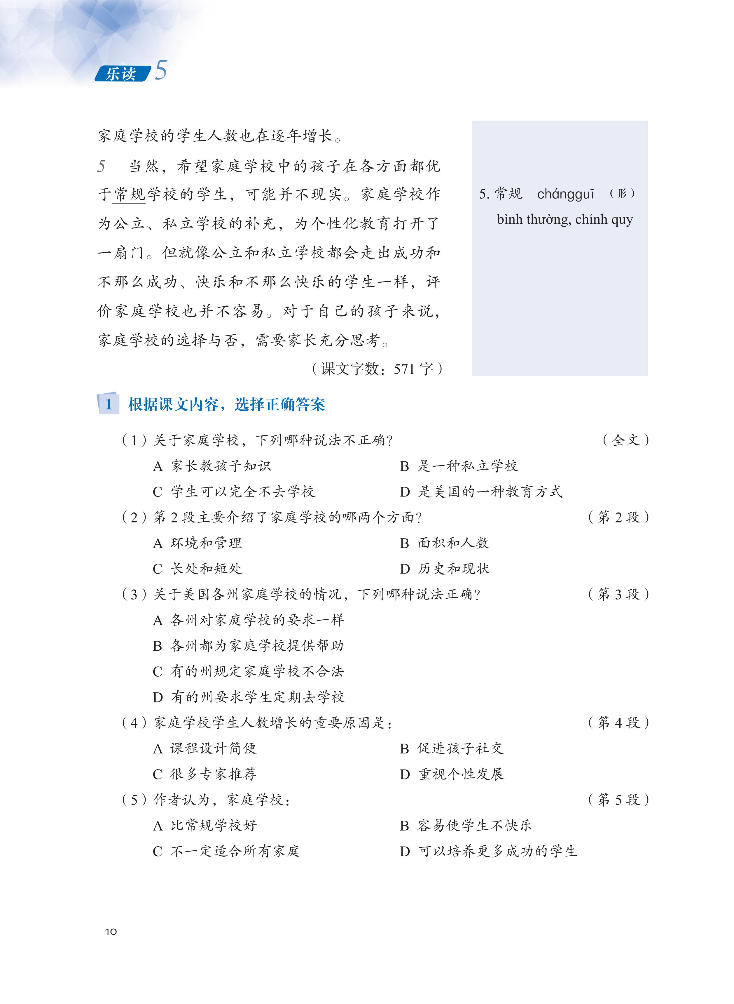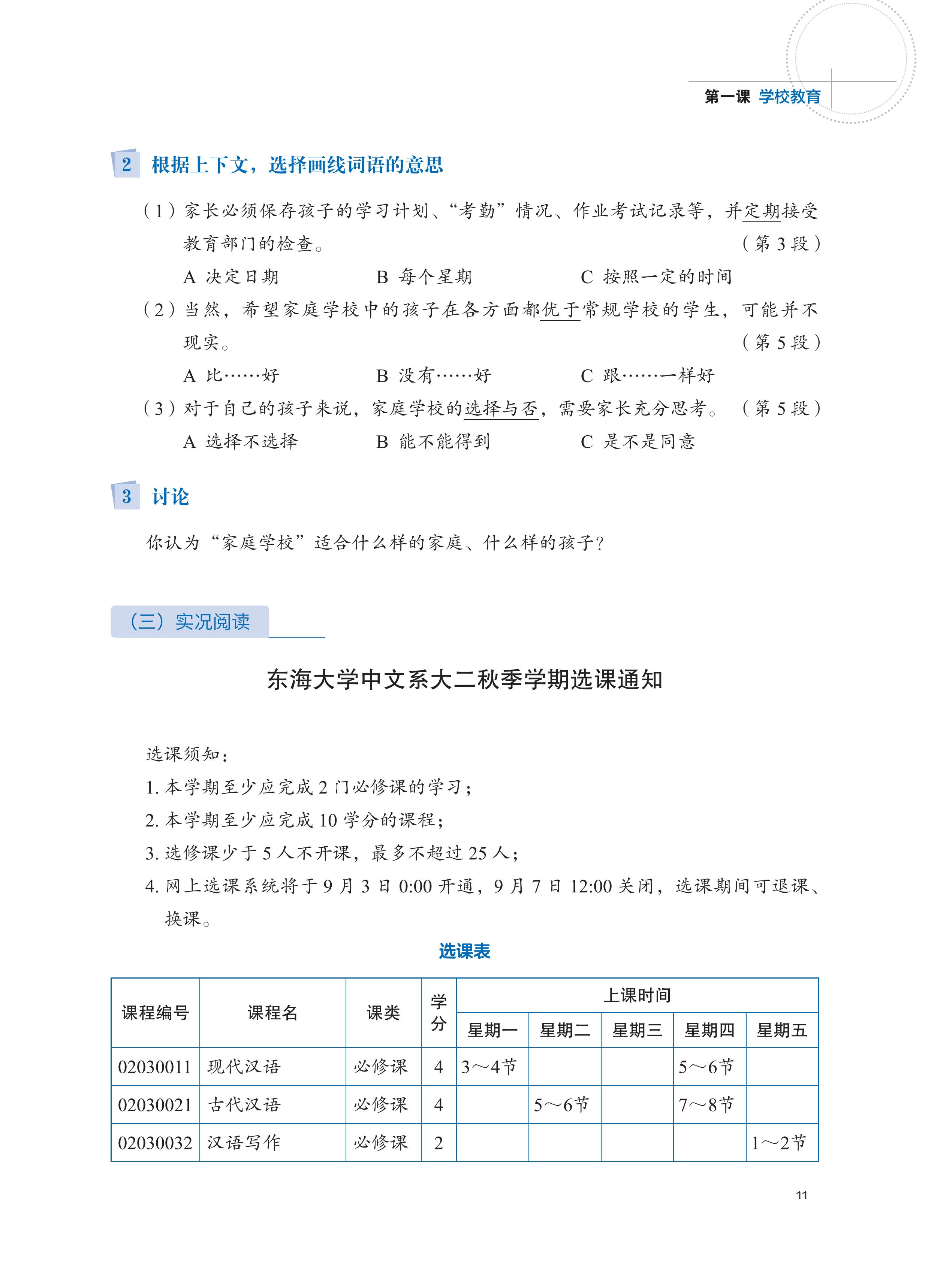 Thực tiễn đọc hiểu: Đây là phần quan trọng nhất của mỗi bài, do ba bộ phận tạo thành là đọc chuyên sâu, đọc mở rộng và đọc thực tế. Bài khóa ở mỗi bộ phận có chủ đề thống nhất nhưng góc độ khác nhau, ba bài khóa có độ khó giảm dần, chú trọng sự tái hiện của từ mới khi biên soạn bài khóa. Ba bộ phận của phần “Thực tiễn đọc hiểu” ngoài bài khóa còn phối hợp với bài tập có liên quan, chủ yếu bao gồm luyện tập đọc hiểu chữ, từ và câu trọng điểm, đồng thời rút ra và khái quát cấu trúc của bài văn, v.v. Tất cả bài tập đều dùng để kiểm tra và củng cố việc lý giải bài khóa của học sinh. Tóm lại, trong quá trình biên soạn, quyển giáo trình này cố gắng đạt đến mục đích lớp lang và trình tự rõ ràng, tiện cho việc sử dụng.