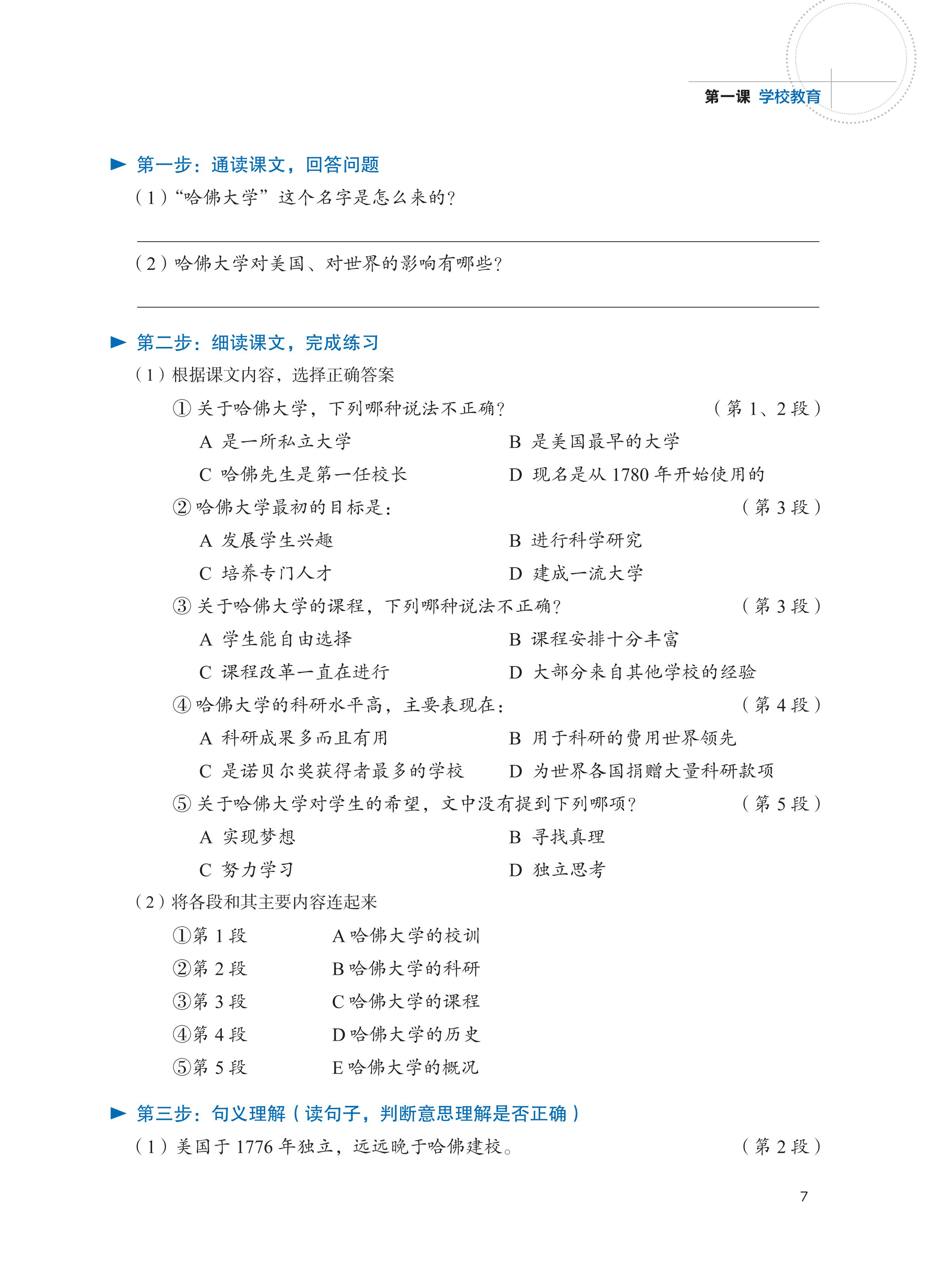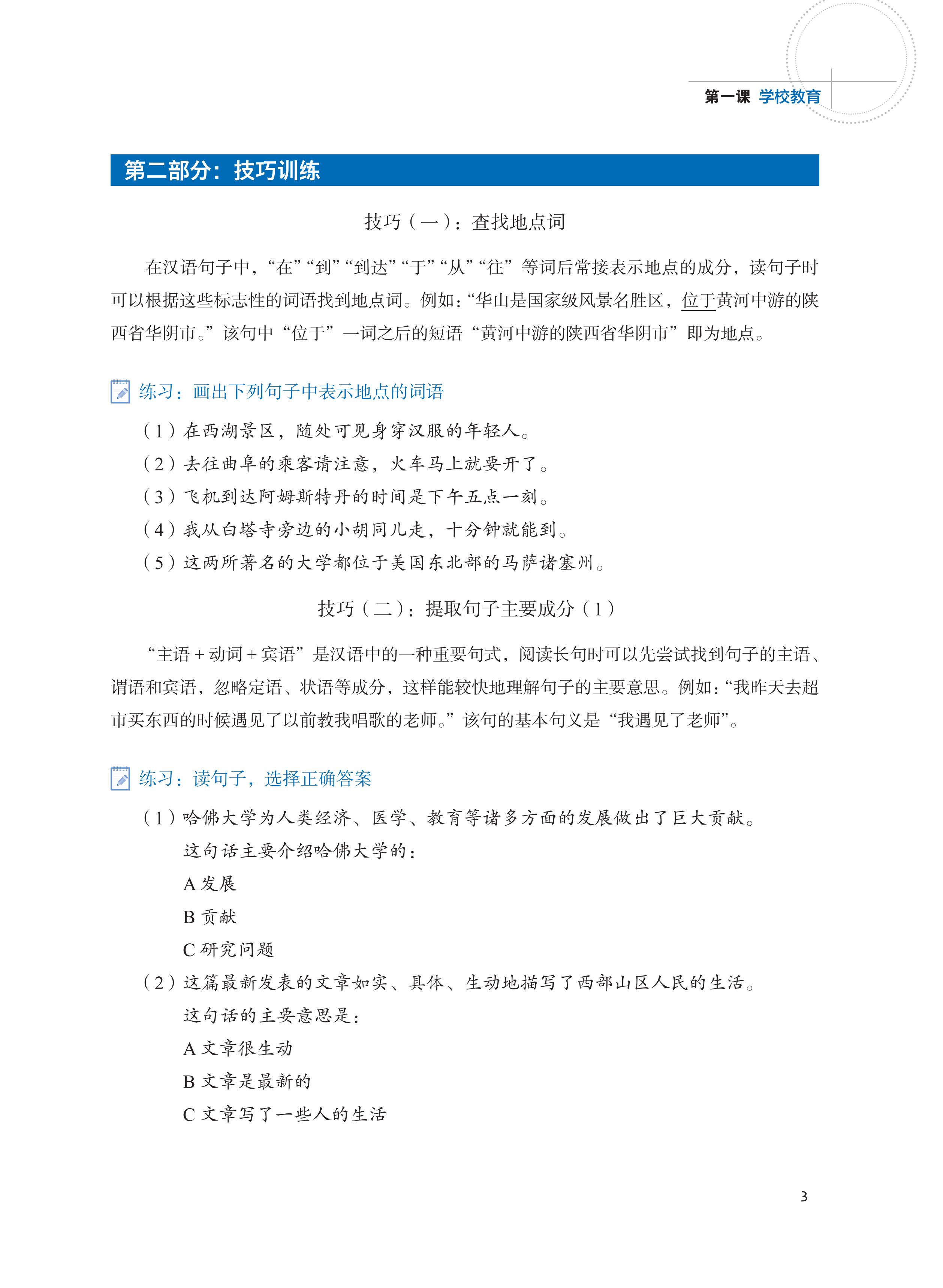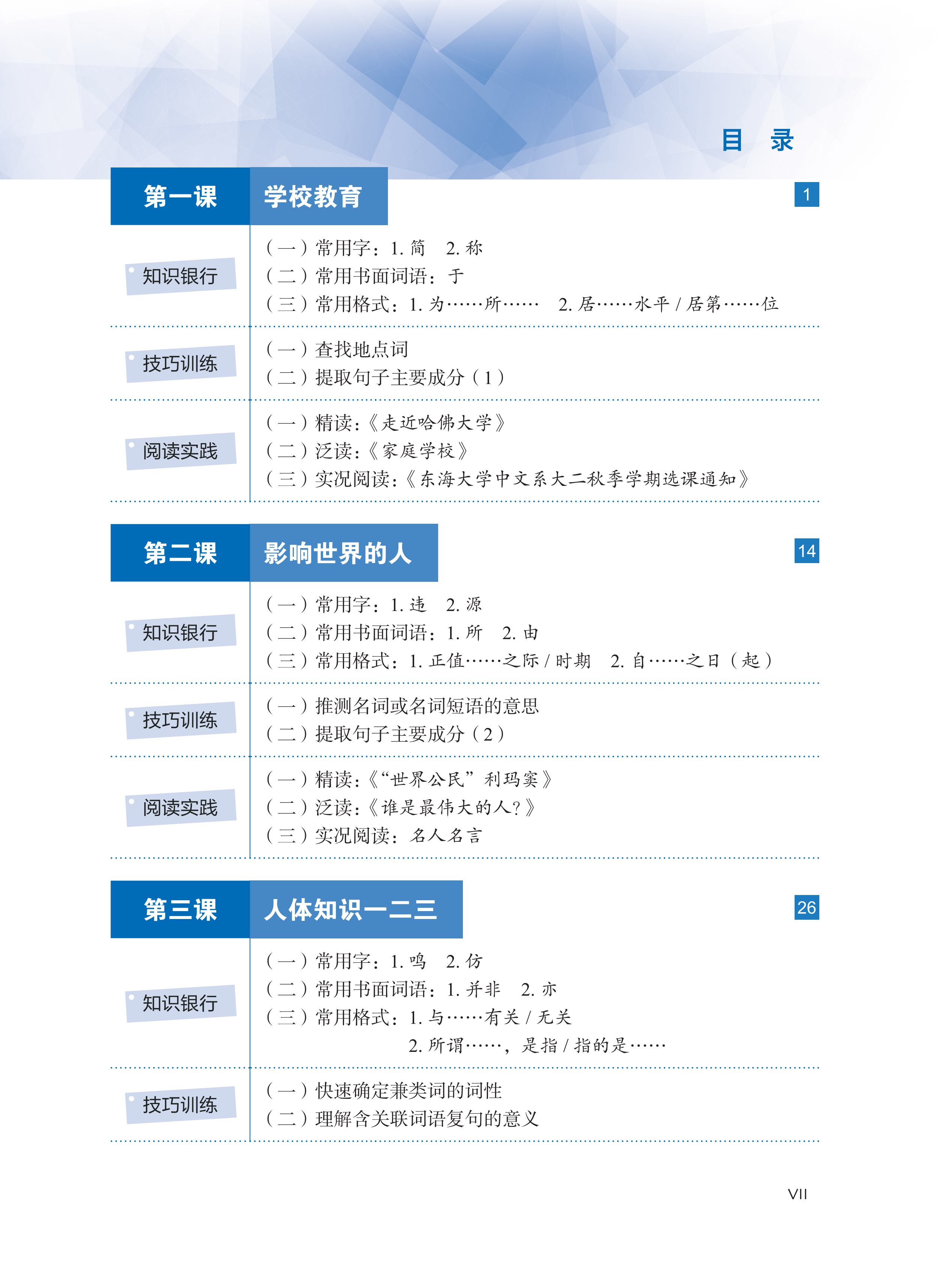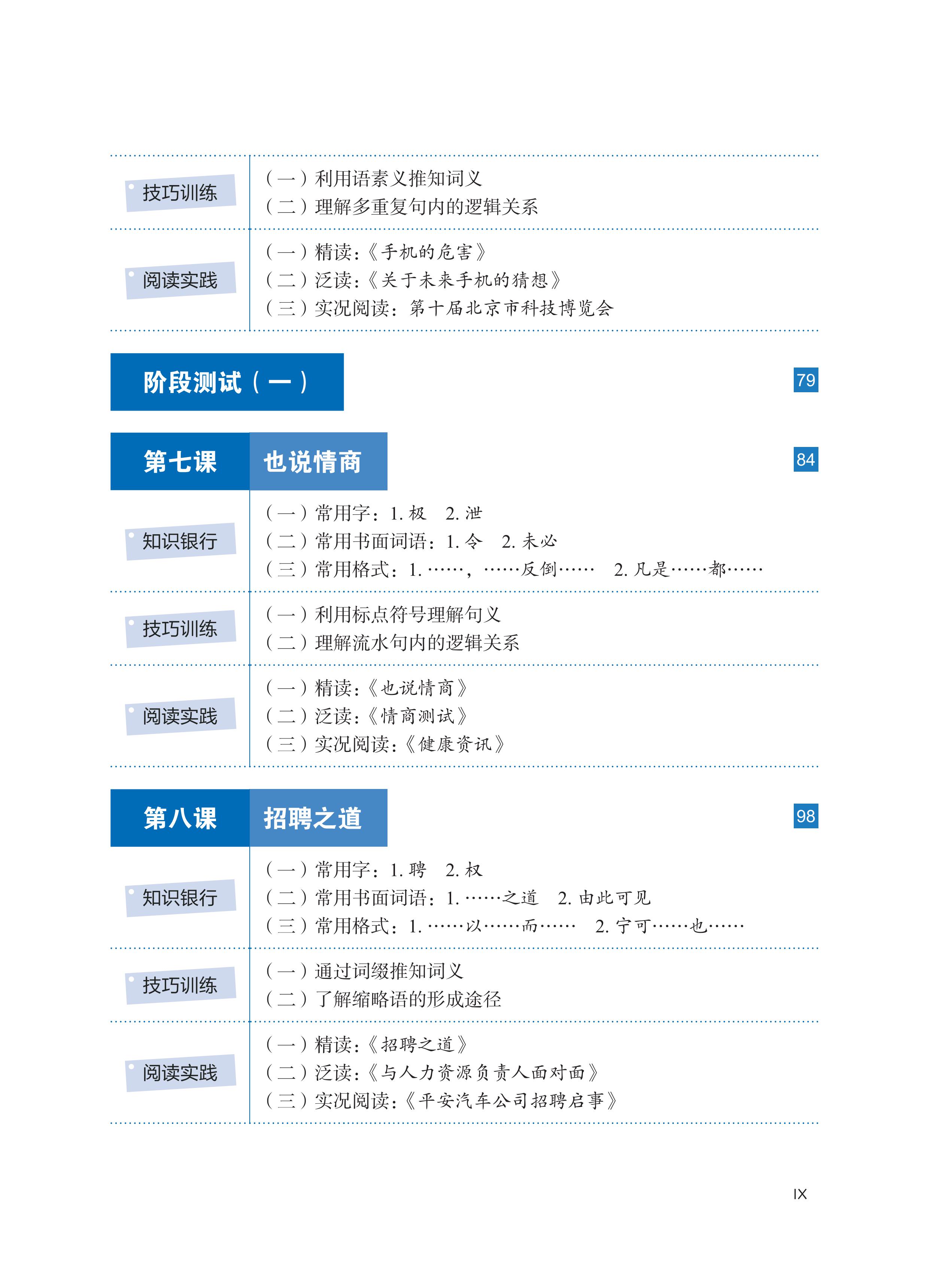 Huấn luyện kỹ xảo: Dựa vào đặc điểm của bản thân tiếng Hán, kết hợp bài khóa của bài, lấy ví dụ thực tế để minh họa, khiến cho người học từ trong thực tiễn hiểu và nắm vững được kỹ xảo đọc thường gặp, như: suy đoán nghĩa từ, tách từ ngắt câu, suy luận và quy nạp, v.v.