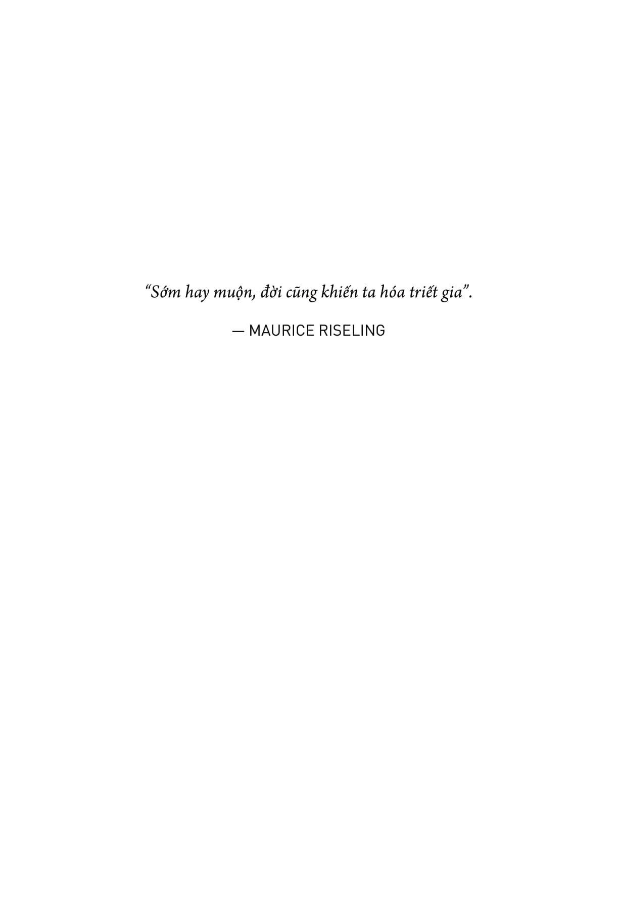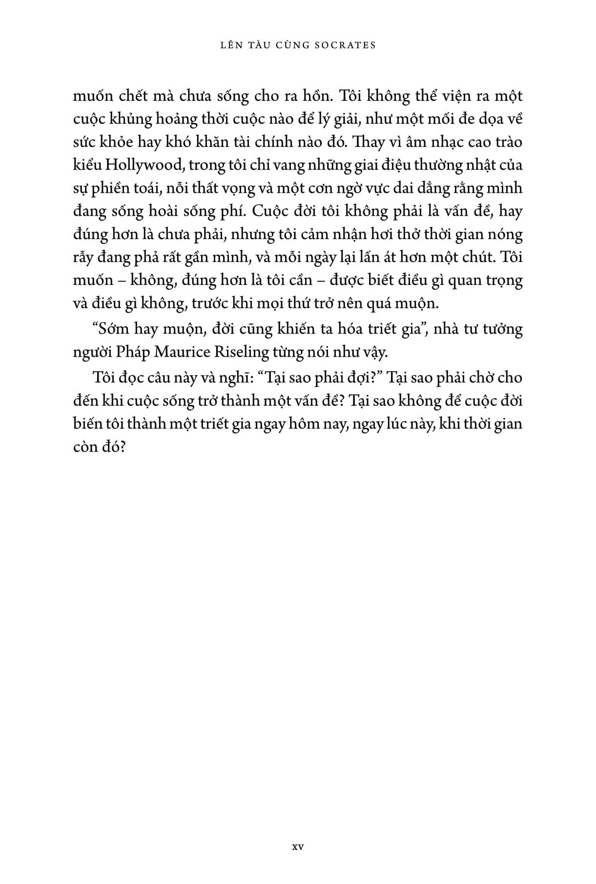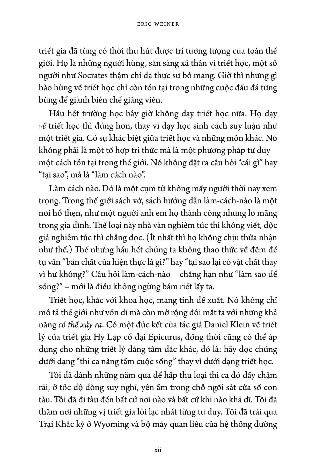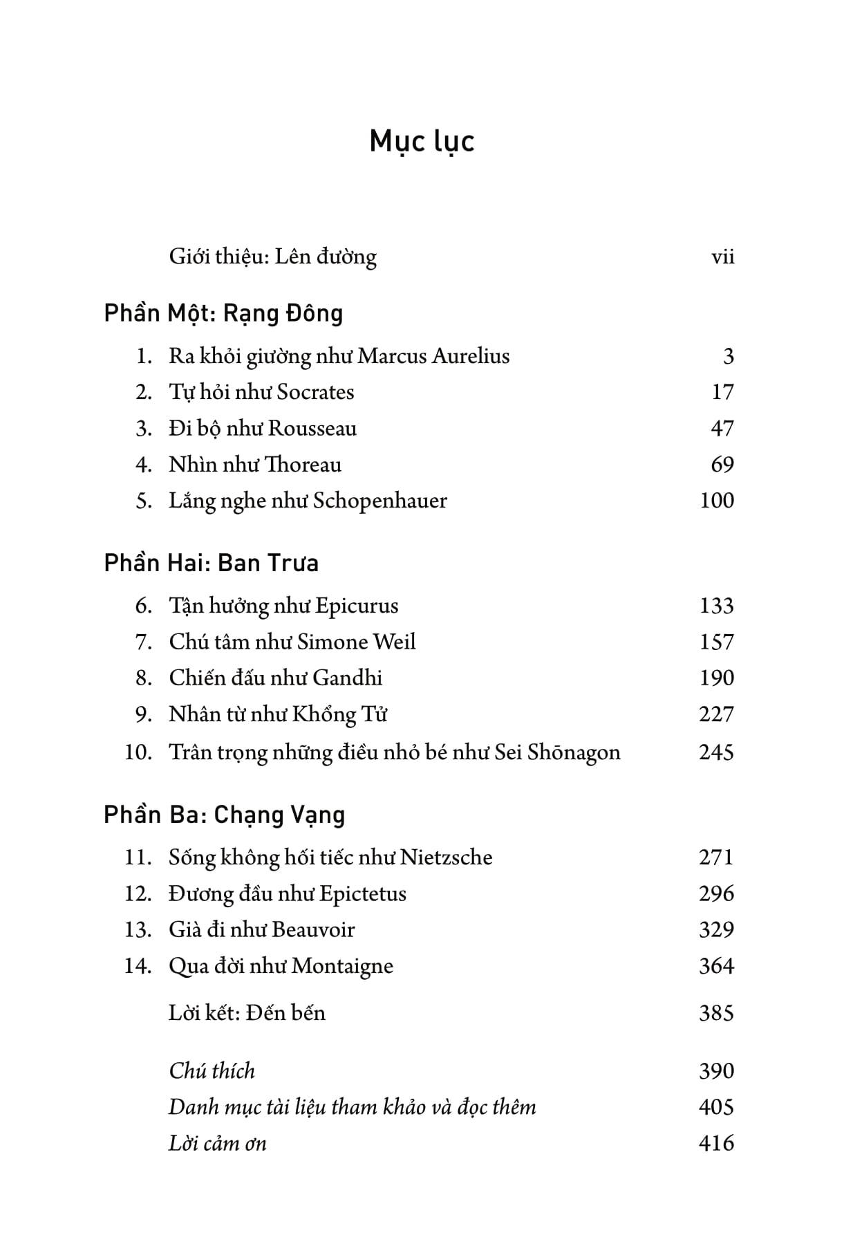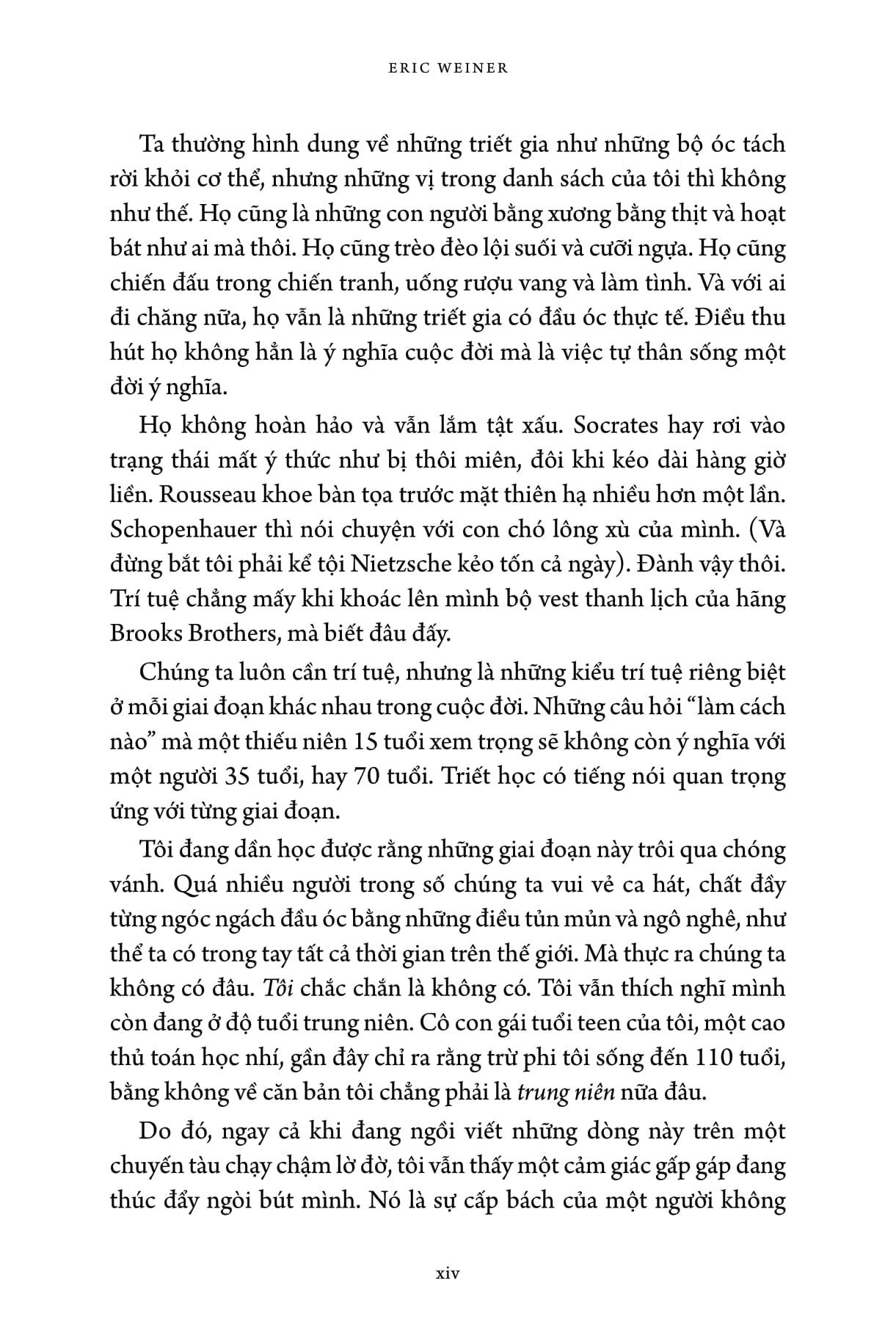 Một cuốn sách viết về triết học, nói những điều triết lý nhưng lại rất đời thường, thiết thực và dễ hiểu. Tác giả chia sẻ những câu chuyện, trải nghiệm của mình khi đi tìm câu trả lời cho những câu hỏi cơ bản của cuộc sống. Mỗi chương như một cuộc đối thoại của tác giả với một triết gia. Đó là 14 vị triết gia thông thái, theo những kiểu khác nhau, với đa dạng những sắc thái trí tuệ. Sự hiện diện của họ bao trùm lên một khoảng thời gian dài đằng đẵng – Socrates sống ở thế kỷ thứ năm trước công nguyên, Simone de Beauvoir ở thế kỷ 20 – và một không gian rộng bao la: từ Hy Lạp đến Trung Quốc, Đức đến Ấn Độ. Họ đều đã qua đời, nhưng những nhà triết học lỗi lạc không bao giờ chết thực sự, mà họ tiếp tục sống trong tâm trí người khác. Trí tuệ có tính lưu động, vượt lên trên không gian và thời gian, và mãi mãi không lỗi thời. Độc giả sẽ cùng tác giả và những vị triết gia này đi tìm câu trả lời cho những vấn đề thú vị: