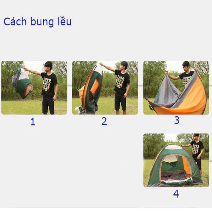 Kích thước: 2m x 1.5m x 1.4m Khung lều làm từ sợi thủy tinh tổng hợp có dẻo dai tạo độ bền sử dụng lâu dài cho sản phẩm Mặt ngoài lều được tráng 1 lớp bạc giúp chống tia tử ngoại rất tốt Thiết kế nhỏ gọn, sức chứa 2-3 người giúp bạn dễ dàng mang theo Đường chỉ may cẩn thận, chắc chắn Lều có sẵn các phụ kiện cố định lều xuống đất khi thời tiết có gió to  Cửa sổ lưới kéo bên trong Tháo lắp dễ dàng, nhanh chóng Khả năng kháng nước và chịu lực tốt . Thích hợp cho 2-3 người sử dụng Cách lắp đặt Lều Cắm Trại Lều Du Lịch Tự Bung Gấp Gọn Chống Nước 4-6 Người ( 2 X 1.5 X 1,35 m) : Trải lều ra trên mặt đất bằng phẳng Nối các thanh rời thành 2 thanh dài sau đó luồn qua đường may sẵn hình chữ X Tại 4 góc lều tra đầu thanh vào lỗ nhựa ở các góc Buộc dây ở đỉnh lều để đỉnh lều cố định Cắm đinh vào 4 góc lều để cố định lều