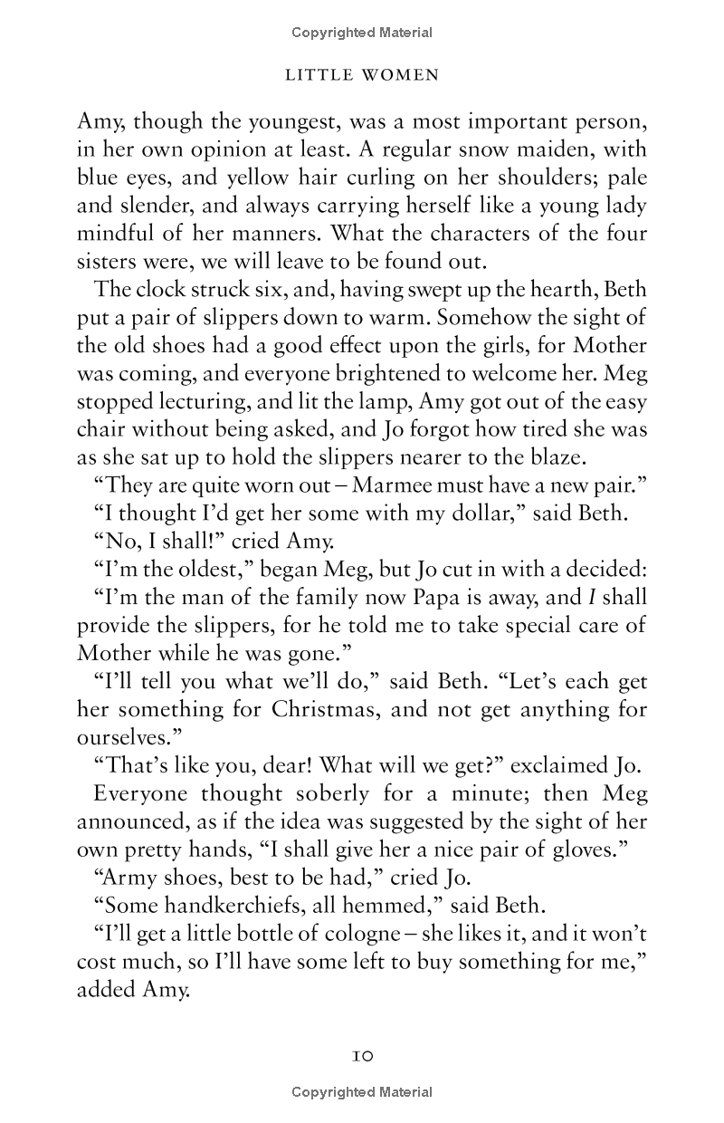 The four March sisters--Meg, Amy, Beth, and feisty Jo--share the joys and sorrows of growing up while their father is away at war. The family is poor in worldly goods, but rich in love and