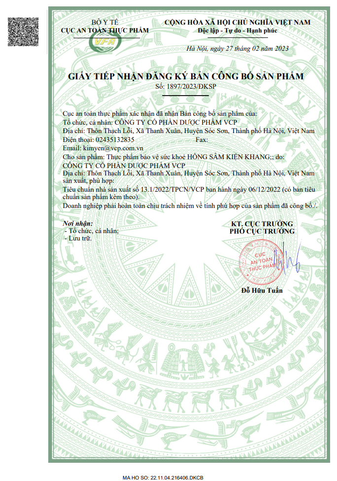 TPBVSK HỒNG SÂM KIỆN KHANG hỗ trợ tăng cường sức khỏe, tăng cường sức đề kháng, giảm mệt mỏi. 1. THÔNG TIN - Dạng bào chế: Viên nang cứng - Quy cách đóng gói: 1