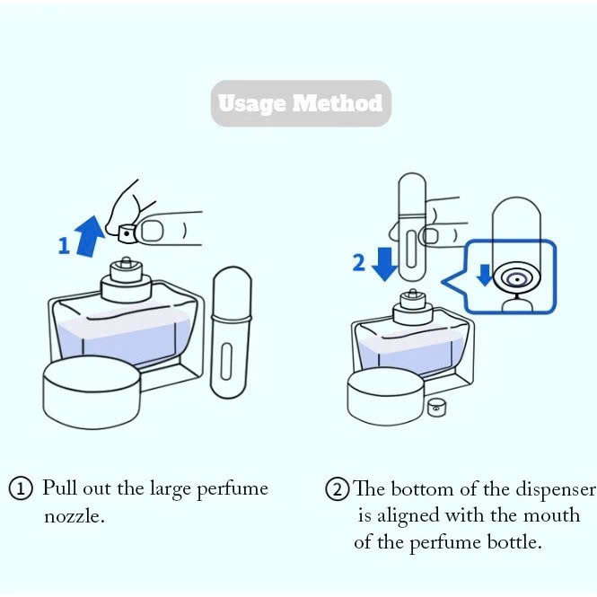 Trước khi chiết, vui lòng mở nắp chai, ấn vòi vài lần, thoát khí ra khỏi chai, sau đó đổ đầy. Nếu bạn không thoát không khí ra khỏi ống, nước hoa sẽ tràn ra ngoài.