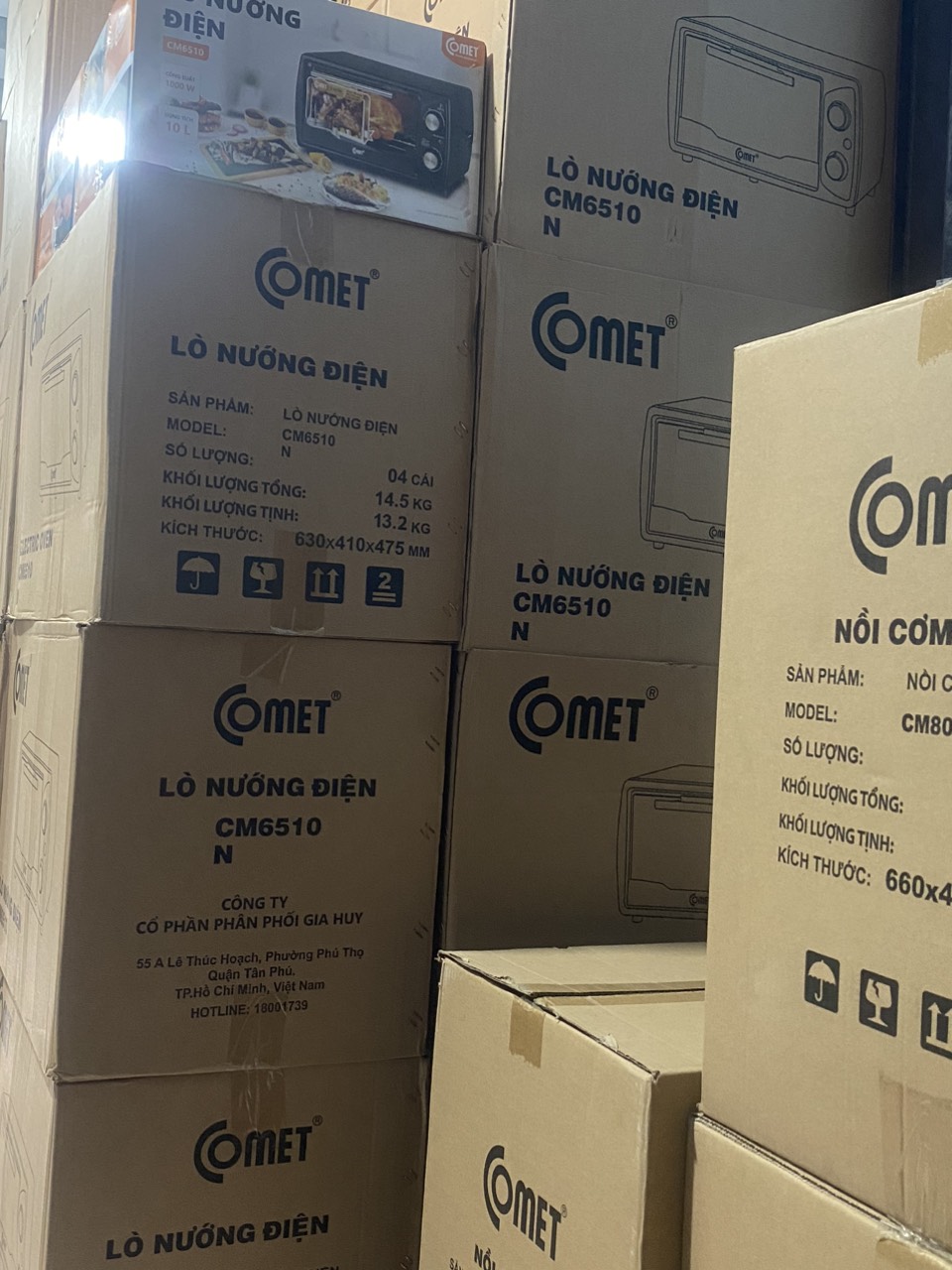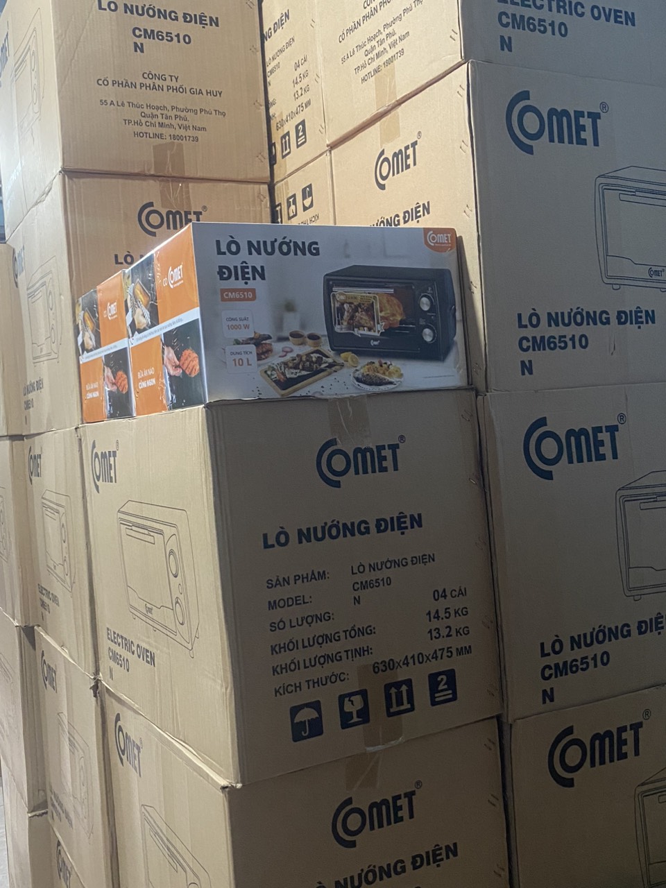 • Trang bị sẵn khay hứng dầu có thể tách rời. THÔNG TIN KỸ THUẬT:   1.Thương hiệu: Comet   2.Sản phẩm: Lò nướng điện 3.Mã sản phẩm: CM6510 4.Điện áp: 220V - 50Hz 5.Công suất: 1000W 6.Dung tích: 10L 7.Kích thước: 395305224 – Cân nặng: 3.3kg 8.Bảo hành : 12 tháng 9.Công dụng: Quay, nướng, hâm, rã đông…. Khách sỉ lẻ cần tư vấn liên hệ shop