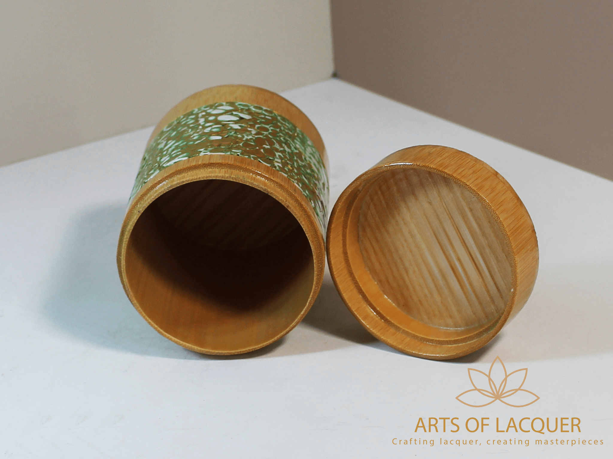 Sản phẩm trong hình là "Lọ Tre Sơn Mài Xanh Lá Cây" từ Arts of Lacquer. Hộp có thiết kế tròn với nền màu vàng nhạt và vảy xanh lá cây, được trang trí bằng