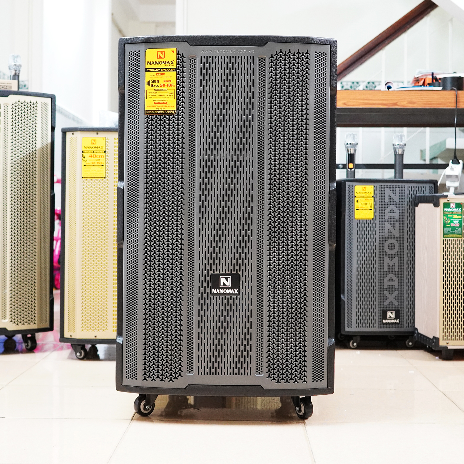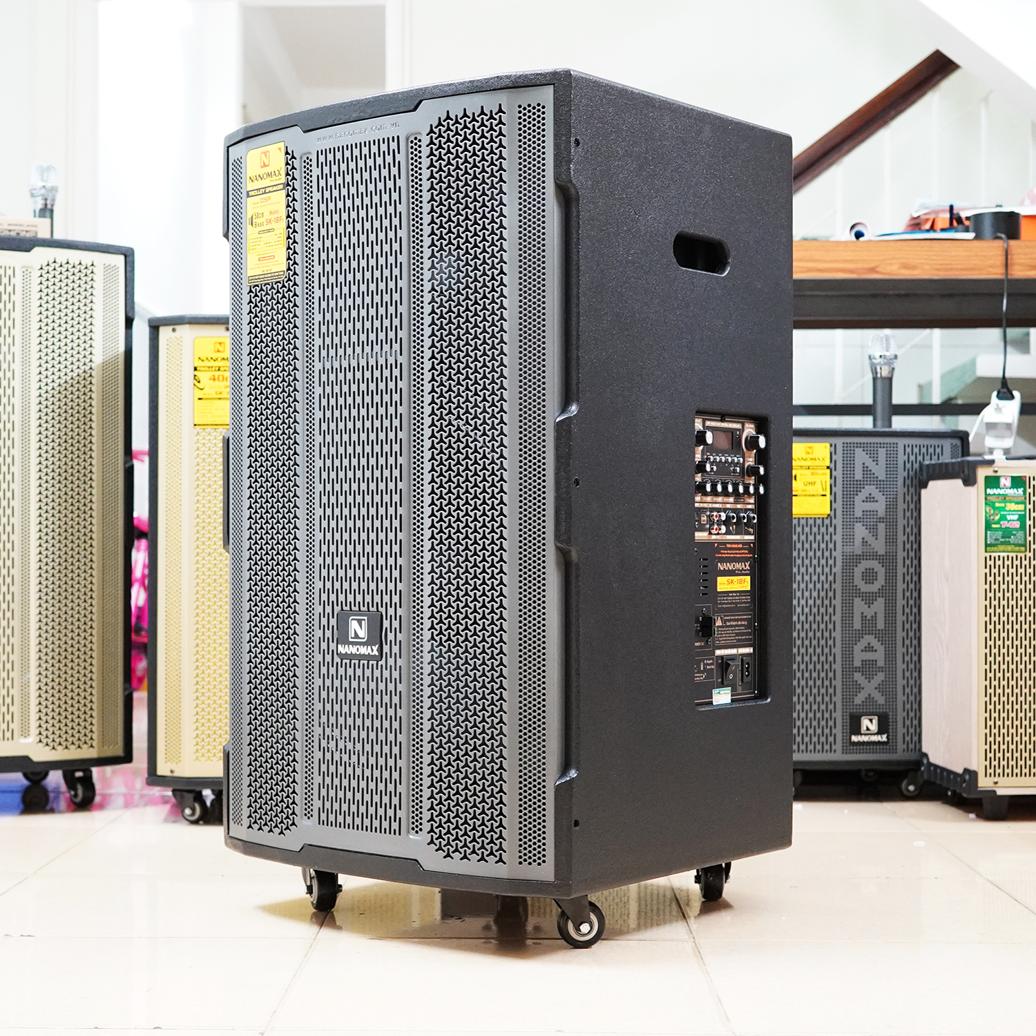 Cuối cùng, loa kẹo kéo Nanomax SK-18F5 có ngoại hình hầm hố 51x53x89cm thực sự rất lớn ngang con loa 6 tấc, loa Bass đập khỏe mạnh, khi cần có thể chỉnh thành chất âm ấm; loa Treble vang xa, kết hợp loa Mid tạo ra âm thanh có chất lượng vượt trội, đi rất xa, nên chỉ những không gian rộng thoáng mới đủ để em nó thể hiện bản lĩnh của mình.