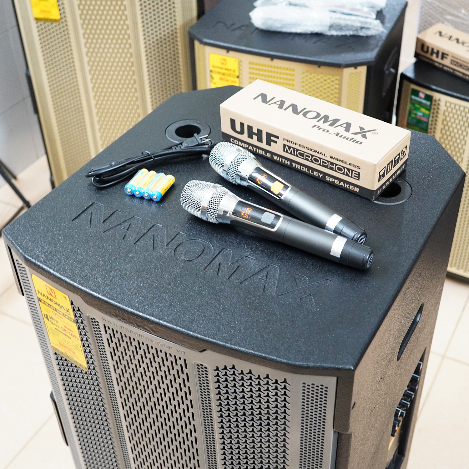 Loa Kéo Nanomax SK-0209 Bass 40cm (4 Tấc) Công Suất 650w Hát Karaoke Bluetooth Bao Xa Tặng 2 Micro Không Dây Tùy Chỉnh Tần Số UHF Và 4 Pin AA. THÔNG SỐ LOA KÉO NANOMAX
