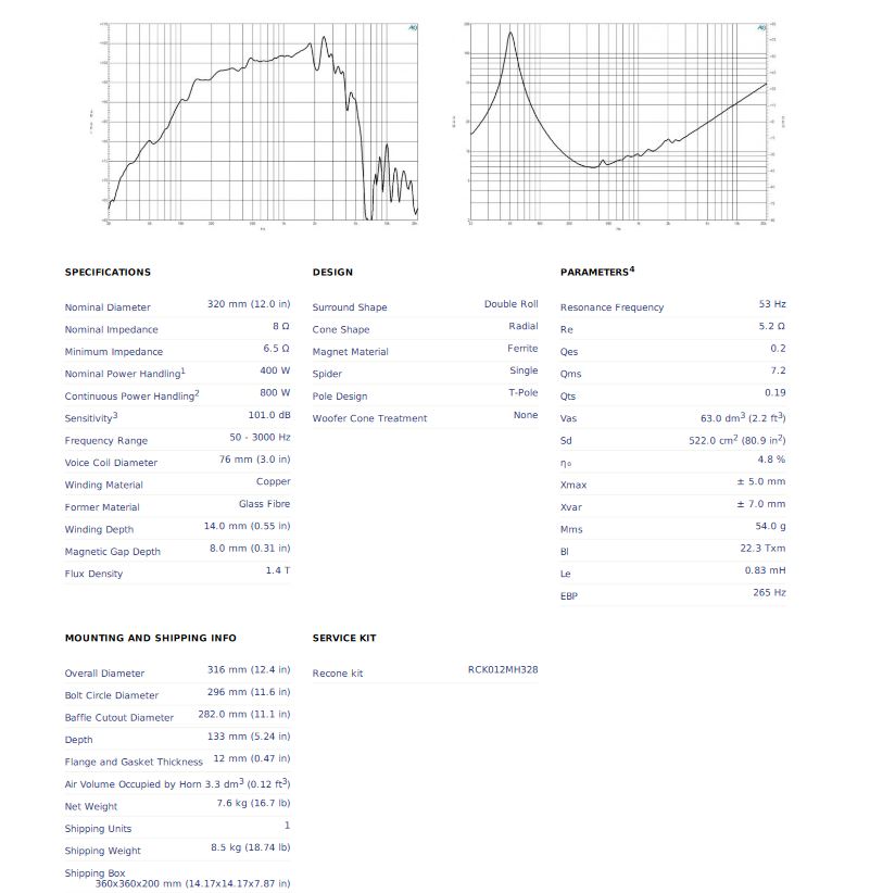 Loa bass rời 3 tấc (12 inches) B&C Speakers 12MH32 có công suất 400/800 W, coil loa bằng đồng 76 mm, tần số 50 – 3000 Hz, độ nhạy 101 dB, nam châm từ Ferrite mạnh mẽ, trở kháng 8 ohms, là lựa chọn lý tưởng cho việc lắp đặt hệ thống âm thanh sân khấu FOH, hệ thống âm thanh trực tiếp, loa monitor, karaoke và nhiều ứng dụng âm thanh khác.