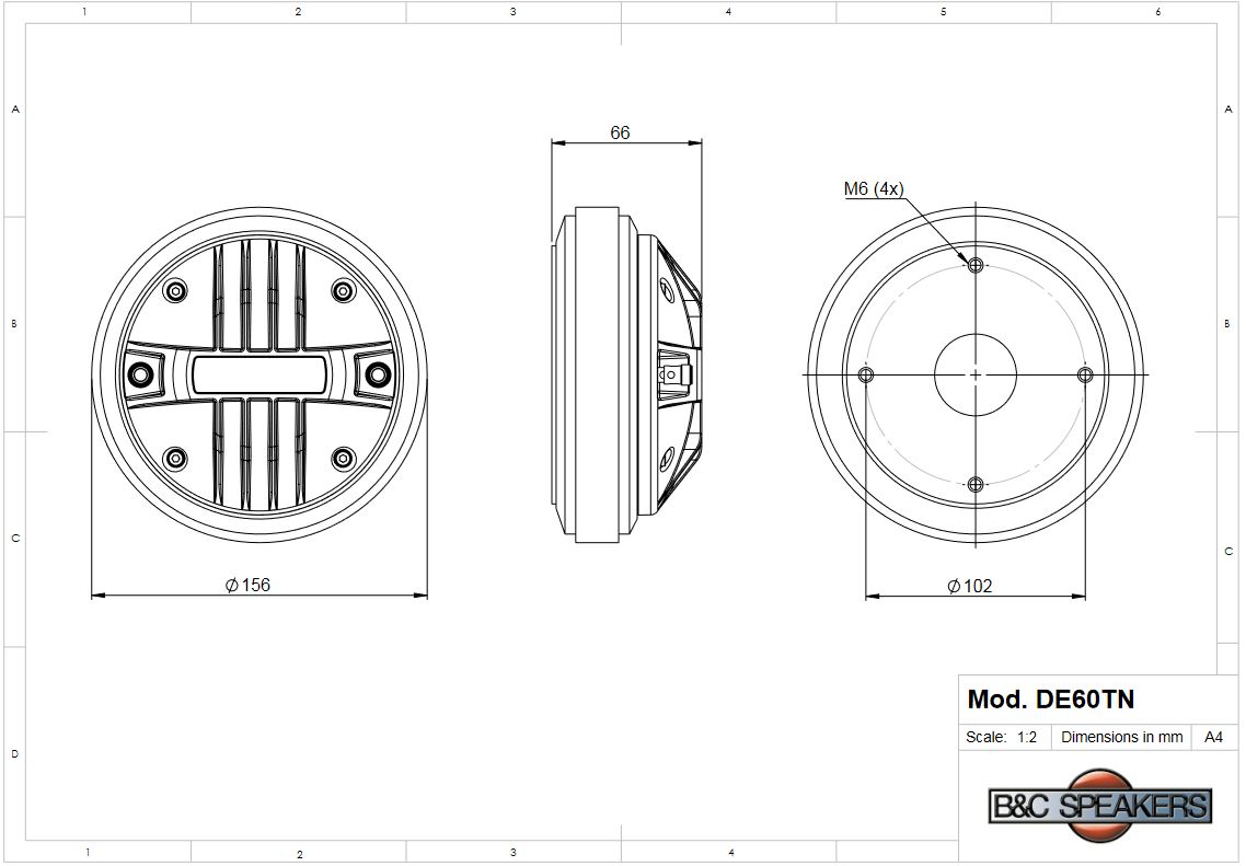 Mua tại TiktokLoa Treble B&C SPEAKERS DE60TN Xuất xứ: Italia Sử dụng họng 1.4" (ME 90) Voice coil aluminium75mm Công Suất Program 220 W Trở kháng: 8ohms Độ nhạy: 107 db Dải tần: 1000 - 18000hz Titanium diaphragm Kích thước: 156 x 156 x 66 mm - 3.8 kg Bản vẽ: