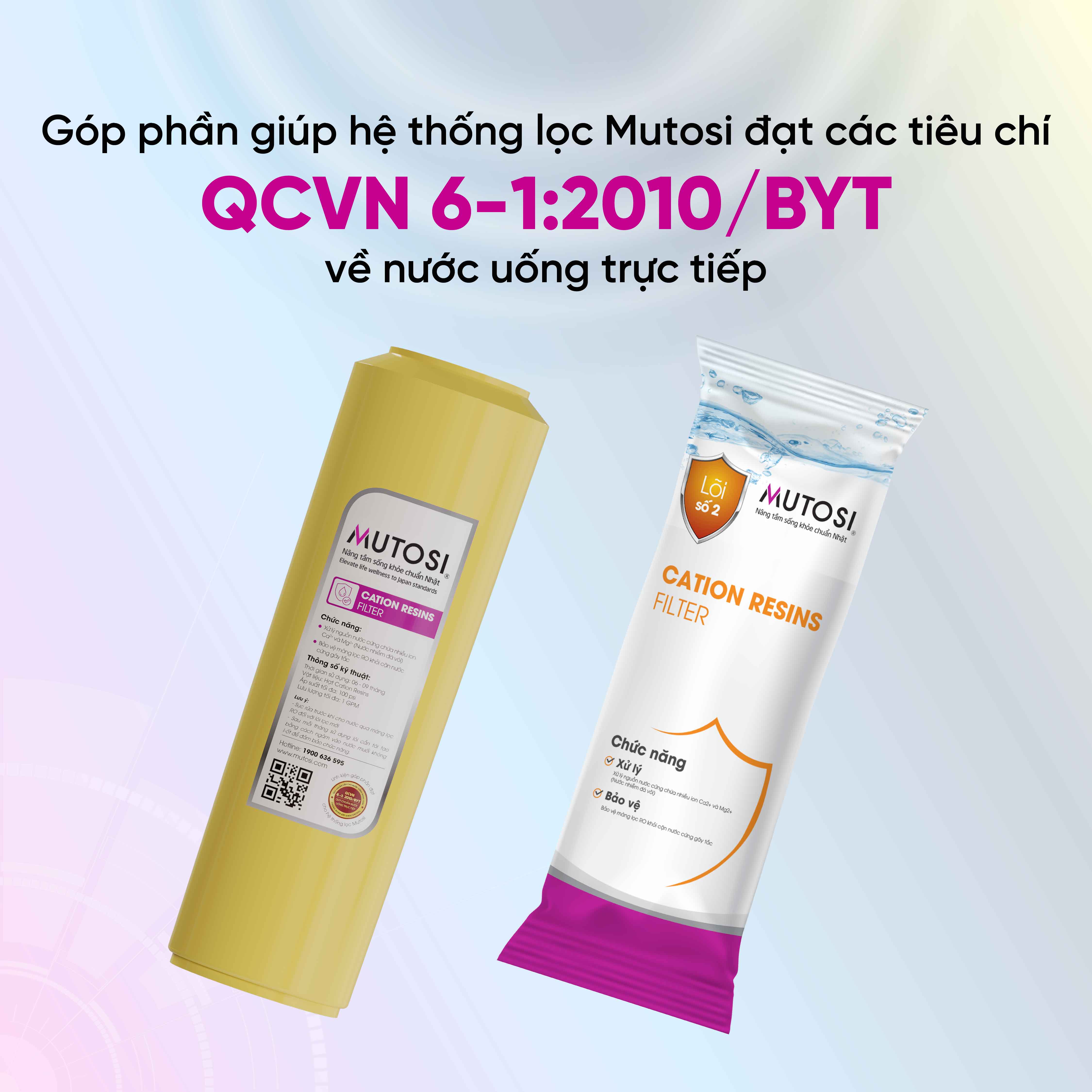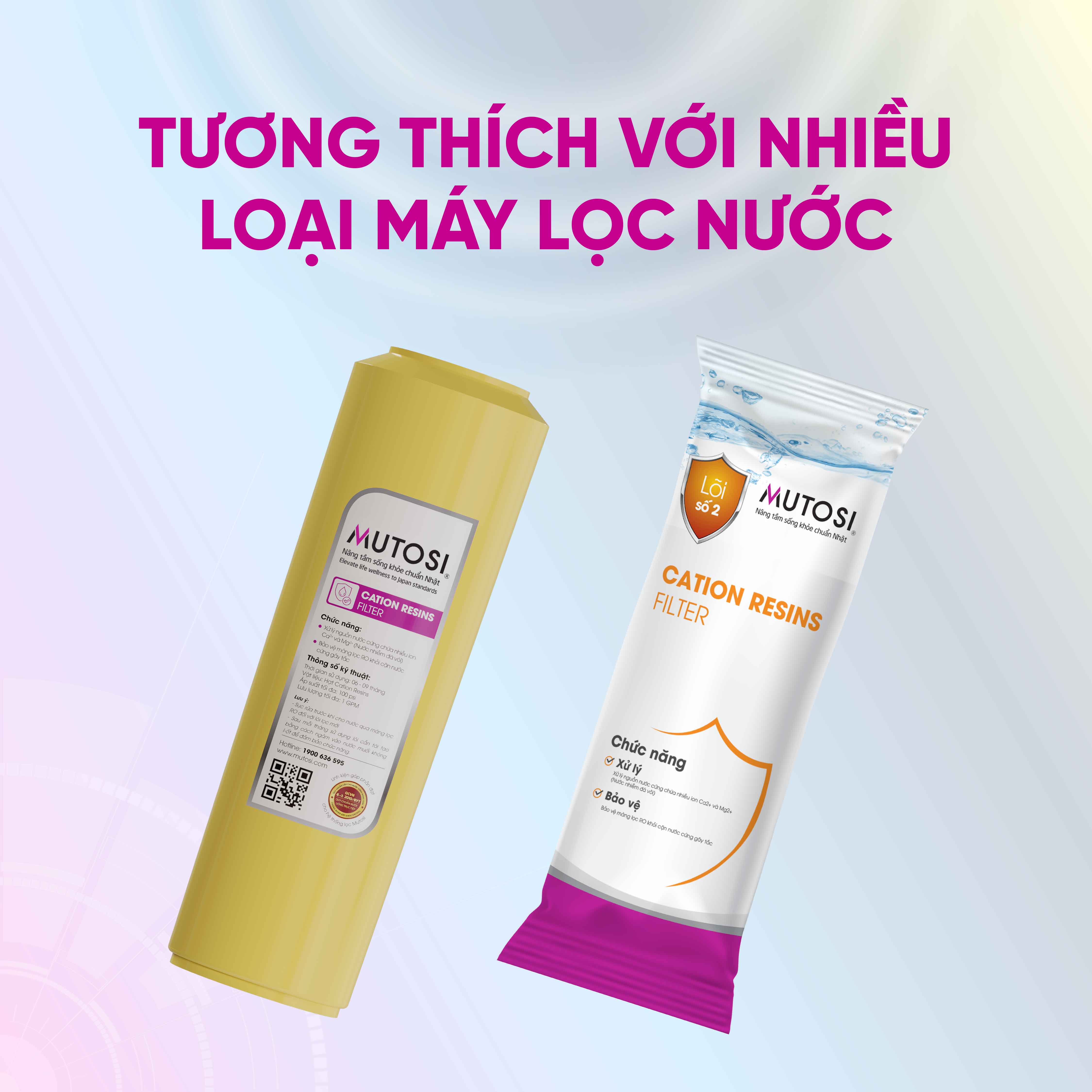 - Giới thiệu chung về lõi lọc số 2 Cation vàng 10 Lõi lọc số 2 Cation vàng 10 được cấu tạo từ thành phần chính là hạt nhựa trao đổi ion cation với mục đích thay thế Na+, loại bỏ Mg2+ và Ca2+. Cation ngoài công dụng làm giảm Mg2+ và Ca2+, sản phẩm còn có công dụng làm “mềm” nước. Lõi lọc số 2 Cation vàng 10 trở thành sản phẩm được nhiều khách hàng tin dùng. Hiện nay, Mutosi hiện là đơn vị uy tín cung cấp lõi lọc số 2 Cation vàng 10 trên thị trường. Với sứ mệnh “Bảo vệ và nâng tầm sống khỏe chuẩn Nhật”, Mutosi ngày càng được nhiều người dùng tin tưởng lựa chọn.