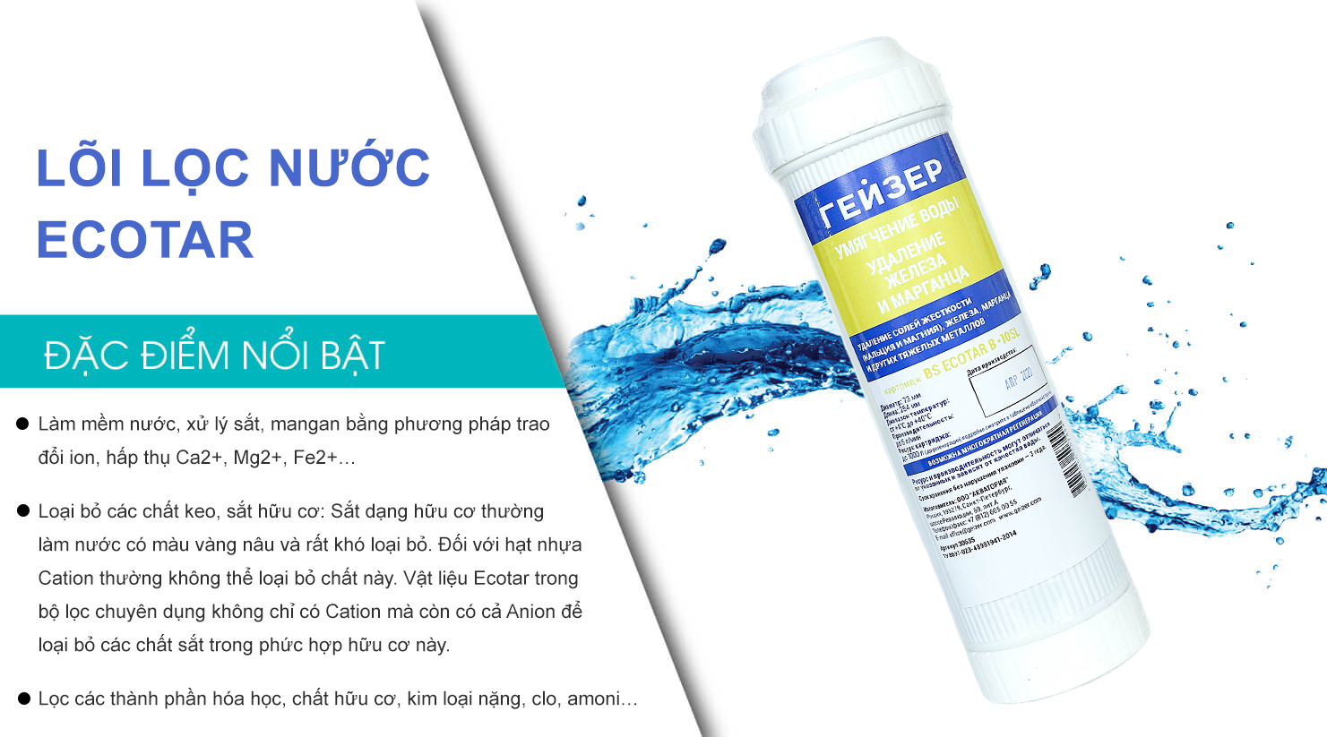 Lõi lọc nước Ecotar được pha trộn giữ các vật liệu đặc biệt theo tỷ lệ khoa học giúp loại bỏ kim loại nặng như Sắt, Mangan, Amoni, nitrit, Aở mức độ nhiễm bẩn cao.