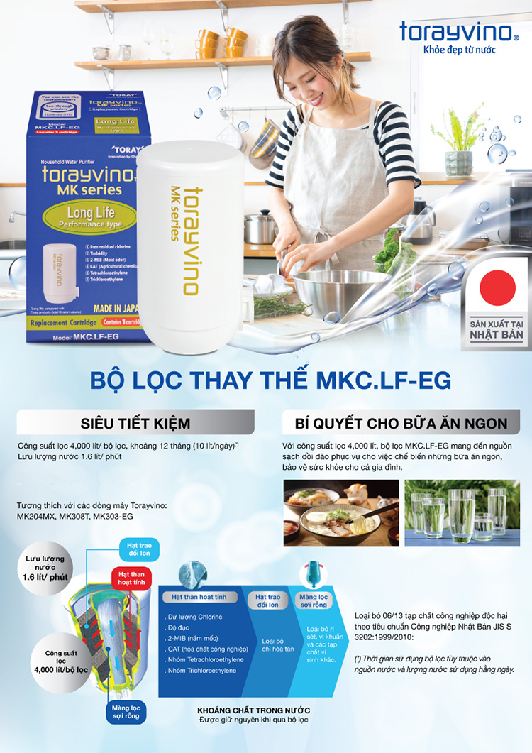 Thiết bị lọc nước tại vòi Torayvino MKC.LF-EG công suấ lớn đến 4000L - Chính hãng Nhật Bản với công nghệ lọc tiên tiến có thể loại bỏ được 6 loại tạp chất và 99,99% vi khuẩn có hại trong nước máy nhưng vẫn giữ nguyên được khoáng chất cần thiết cho nhu cầu nấu ăn, rửa rau quả, rửa mặt và sử dụng nước sạch hàng ngày của gia đình.