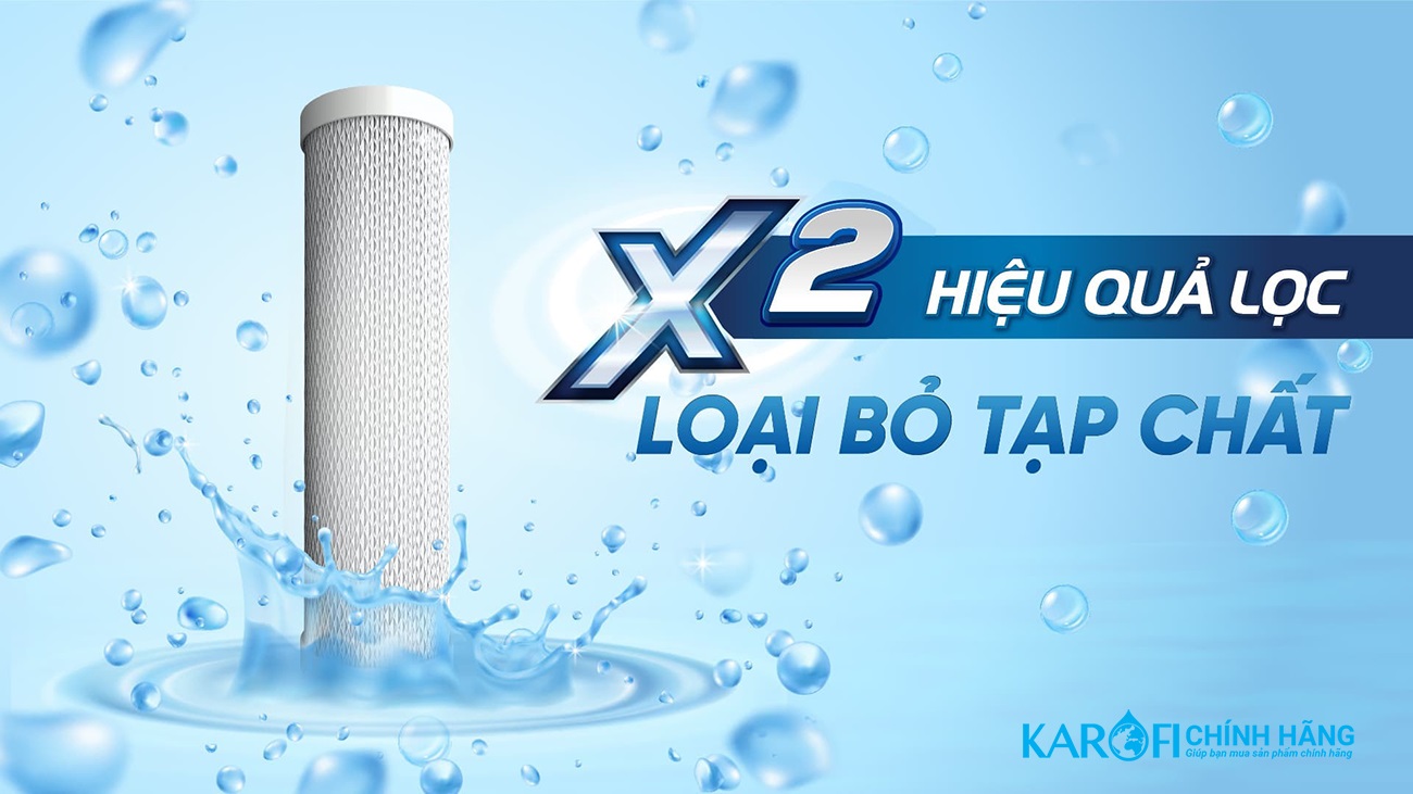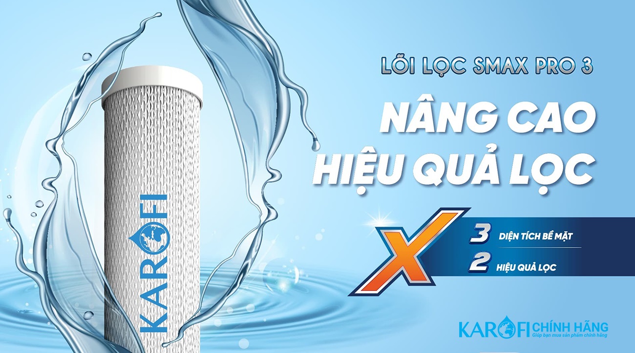 - Tiết kiệm 20% chi phí THÔNG SỐ KỸ THUẬT LÕI LỌC THÔ KAROFI SMAX PRO 3 Kích thước 70 x 255 mm Xuất xứ Chính hãng Thời hạn sử dụng 12 tháng Bảo hành 12 tháng Vị trí lắp Vị trí số 3 Lưu lượng tối đa 100 lít/giờ Áp suất sử dụng 5 bar Vật liệu Polypropylen Nhiệt độ hoạt động tối đa 45 độ C GIỚI THIỆU SẢN PHẨM LÕI LỌC THÔ KAROFI SMAX PRO 3 CHI TIẾT SẢN PHẨM Tổng quan Lõi lọc thô Karofi Smax Pro 3 Được nghiên cứu và sản xuất trên dây chuyền hiện đại, trải qua quá trình gia nhiệt ở nhiệt độ cao và ứng dụng công nghệ Smax Pro mới, lõi lọc Smax Pro 3 mang tới hiệu quả lọc nâng cao. Công nghệ Smax Pro Điểm đặc biệt của công nghệ Smax Pro đến từ cấu tạo 5 lớp màng lọc vi sợi liên kết đa điểm kích thước siêu nhỏ cỡ micron, sắp xếp theo cấu trúc gấp rẻ quạt thông minh. X3 diện tích tiếp xúc Nhờ thiết kế tối ưu, diện tích tiếp xúc với nước tăng gấp 3 so với thông thường, giúp lọc nhanh hơn, giảm nguy cơ bị tắc lõi. X2 hiệu quả lọc Lõi lọc Smax Pro 3 giúp tăng khả năng loại bỏ tạp chất gấp 2 lần và gấp đôi tuổi thọ so với lõi lọc thông thường. Gia tăng tuổi thọ màng lọc RO Ngoài ra, không chỉ loại bỏ các loại cặn bã, sạn, bùn, tảo rêu, chất rắn, lõi lọc Smax Pro còn giúp loại cặn bẩn mà lõi lọc Smax Pro 1,2 để sót lại, góp phần gia tăng hiệu quả cũng như tuổi thọ của màng lọc RO .