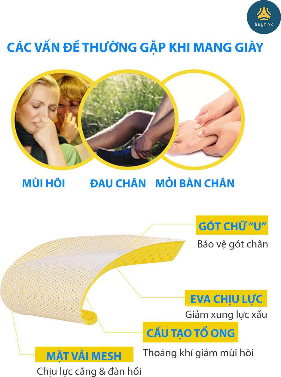 Lót giày có cấu trúc tổ ong thông hơi thoáng khí giúp bàn chân khô thoáng, giảm mùi hôi cho chân.