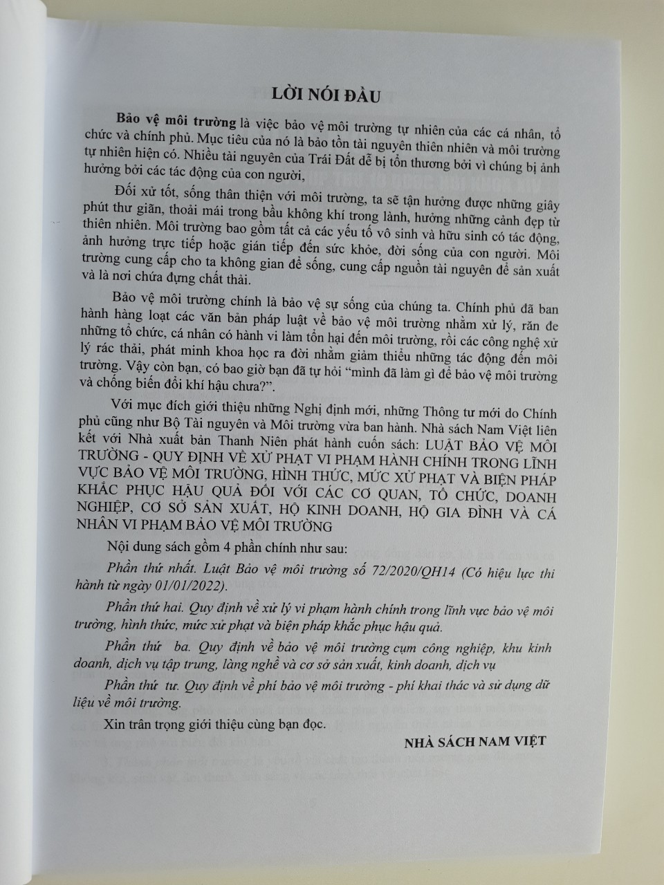- Giá bìa phát hành: 425.000đ, Giá bán áp dụng theo chương trình khuyến mãi từng thời điểm, Giá bán đã bao gồm hóa đơn và bọc sách Plastic MIỄN PHÍ. .... Nội dung sách gồm 4 phần chính như sau: Phần thứ nhất. Luật Bảo vệ môi trường số 72/2020/QH14 (Có hiệu lực thi hành từ ngày 01/01/2022). Phần thứ hai. Quy định về xử lý vi phạm hành chính trong lĩnh vực bảo vệ môi trường, hình thức, mức xử phạt và biện pháp khắc phục hậu quả. Phần thứ ba. Quy định về bảo vệ môi trường cụm công nghiệp, khu kinh doanh, dịch vụ tập trung, làng nghề và cơ sở sản xuất, kinh doanh, dịch vụ Phần thứ tư. Quy định về phí bảo vệ môi trường - phí khai thác và sử dụng dữ liệu về môi trường *** Để tránh mua hàng không như giới thiệu, Quý khách được xem nội dung sách trước khi thanh toán, sách đã được bọc plastic miễn phí!
