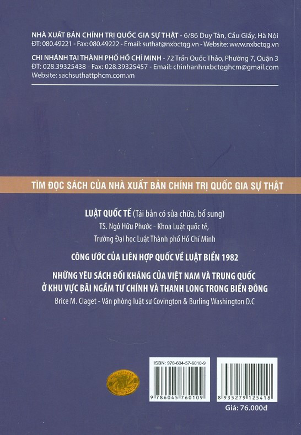 Nhằm mục đích cung cấp cho bạn đọc các kiến thức lý luận, pháp lý cơ bản, thực trạng thực thi luật biển trên thế giới, cũng như quy định về luật biển ở Việt Nam hiện nay, Nhà xuất bản Chính trị quốc gia Sự thật xuất bản cuốn sách “Luật Biển” (Sách chuyên khảo) của TS. Ngô Hữu Phước. Cuốn sách là công trình nghiên cứu chuyên sâu, có hệ thống, góp phần phác họa bức tranh tương đối rõ nét về những vấn đề của luật biển ở bình diện quốc tế cũng như ở Việt Nam. Tác giả, trên quan điểm cá nhân, cũng đưa ra những phân tích, nhận định về các vấn đề pháp lý và thực tiễn có liên quan đến biển, đảo của Việt Nam. Cuốn sách là tài liệu tham khảo có giá trị cho những người hoạt động trong lĩnh vực đối ngoại, pháp luật quốc tế, các luật sư, sinh viên, nhà nghiên cứu trong lĩnh vực pháp luật quốc tế và bạn đọc quan tâm đến vấn đề này.