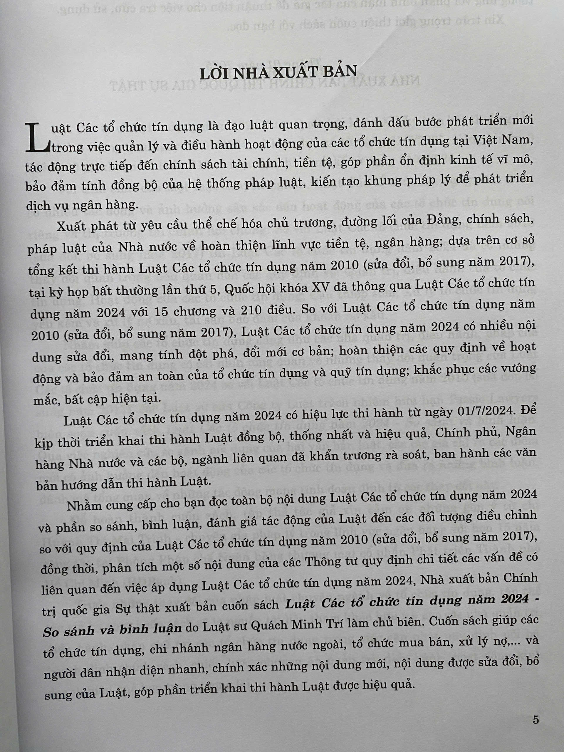 Nhằm cung cấp cho bạn đọc toàn bộ nội dung Luật Các tổ chức tín dụng năm 2024 và phần so sánh, bình luận, đánh giá tác động của Luật đến các đối tượng điều chỉnh so với quy định của Luật Các tổ chức tín dụng năm 2010 (sửa đổi, bổ sung năm 2017), đồng thời, phân tích một số nội dung của các Thông tư quy định chi tiết các vấn đề có liên quan đến việc áp dụng Luật Các tổ chức tín dụng năm 2024, Nhà xuất bản Chính trị quốc gia Sự thật xuất bản cuốn sách Luật Các tổ chức tín dụng năm 2024 - So sánh và bình luận do Luật sư Quách Minh Trí làm chủ biên. Cuốn sách giúp các tổ chức tín dụng, chi nhánh ngân hàng nước ngoài, tổ chức mua bán, xử lý nợ,... và người dân nhận diện nhanh, chính xác những nội dung mới, nội dung được sửa đổi, bổ sung của Luật, góp phần triển khai thi hành Luật được hiệu quả.