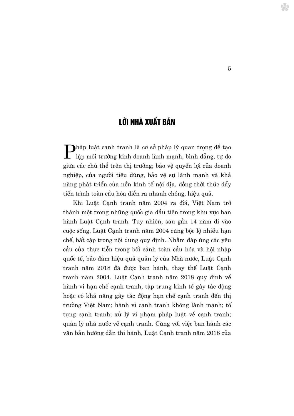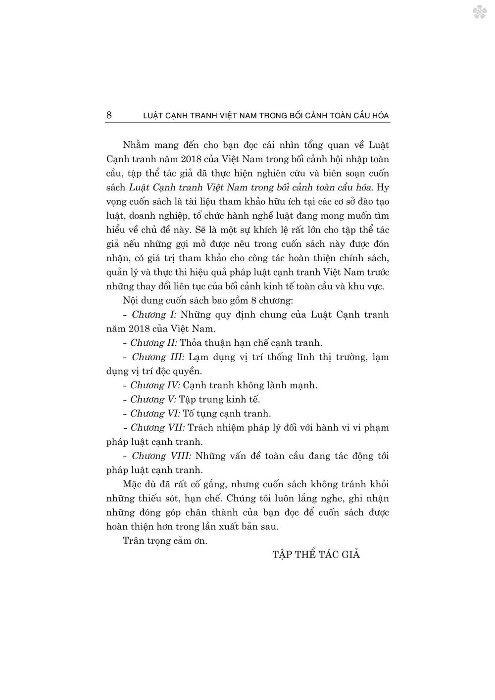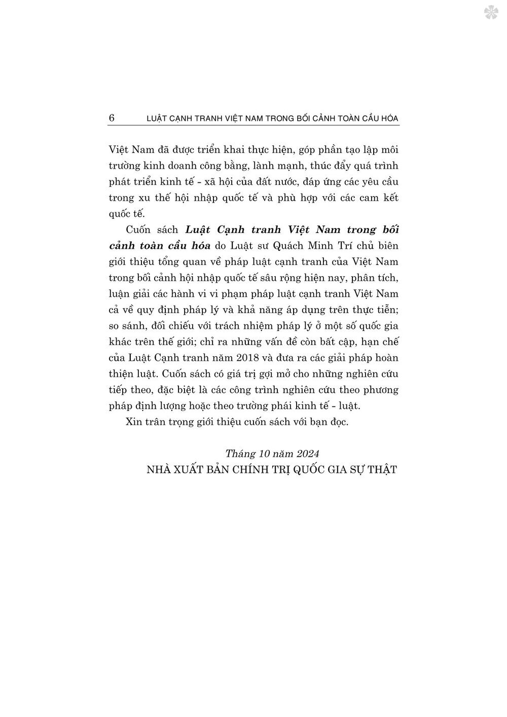 Mua tại TiktokCuốn sách Luật Cạnh tranh Việt Nam trong bối cảnh toàn cầu hóa do Luật sư Quách Minh Trí chủ biên giới thiệu tổng quan về pháp luật cạnh tranh của Việt Nam trong bối cảnh hội nhập quốc tế sâu rộng hiện nay, phân tích, luận giải các hành vi vi phạm pháp luật cạnh tranh Việt Nam cả về quy định pháp lý và khả năng áp dụng trên thực tiễn; so sánh, đối chiếu với trách nhiệm pháp lý ở một số quốc gia khác trên thế giới; chỉ ra những vấn đề còn bất cập, hạn chế của Luật Cạnh tranh năm 2018 và đưa ra các giải pháp hoàn thiện luật.