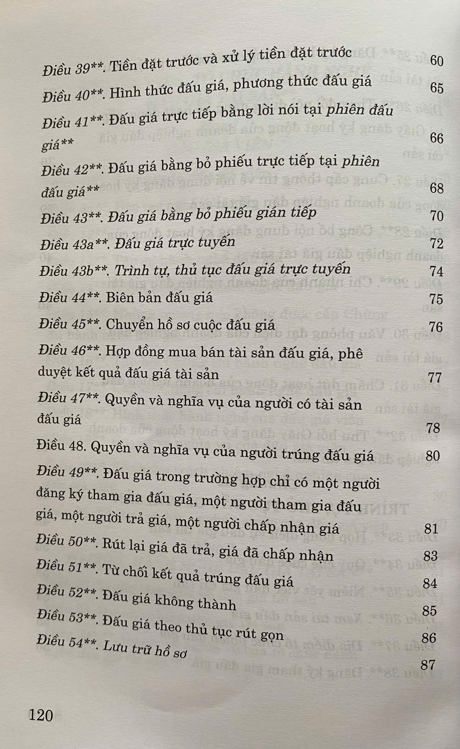 Luật Đấu giá tài sản (hiện hành) gồm 8 chương, 81 điều, quy định về nguyên tắc, trình tự, thủ tục đấu giá tài sản; đấu giá viên, tổ chức đấu giá tài