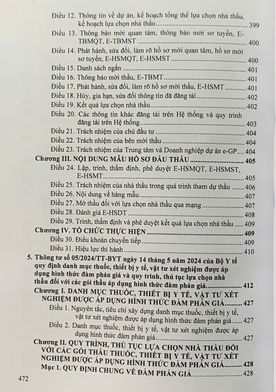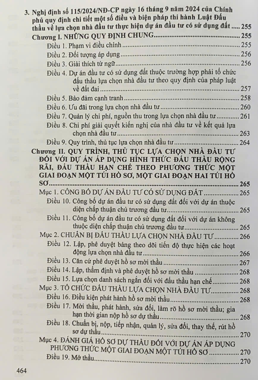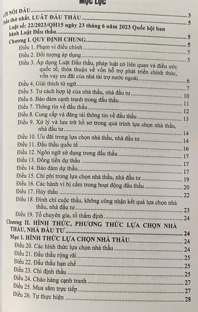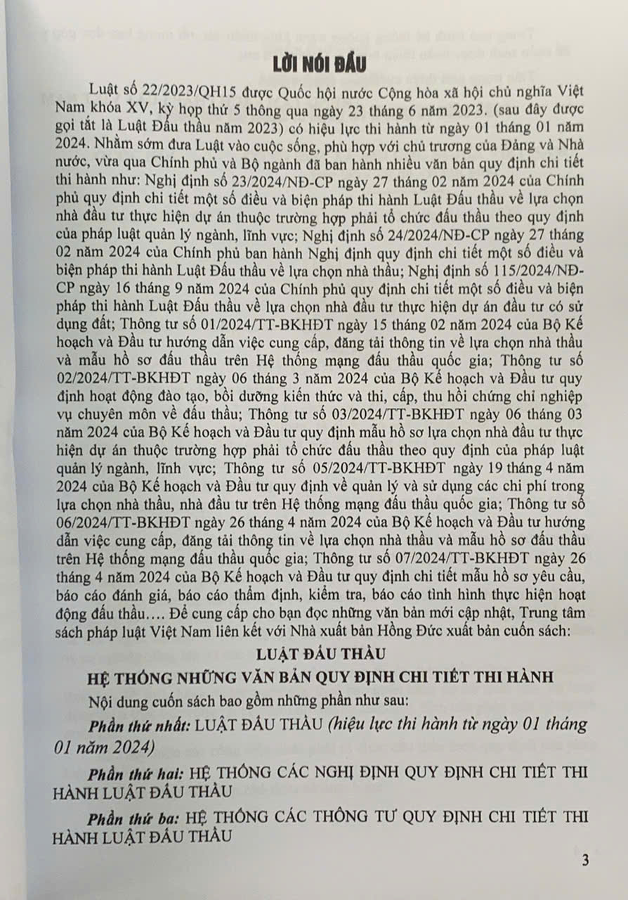 Luật số 22/2023/QH15 được Quốc hội nước Cộng hòa xã hội chủ nghĩa Việt Nam khóa XV, kỳ họp thứ 5 thông qua ngày 23 tháng 6 năm 2023. (sau đây được gọi tắt là Luật Đấu thầu năm 2023) có hiệu lực thi hành từ ngày 01 tháng 01 năm 2024. Nhằm sớm đưa Luật vào cuộc sống, phù hợp với chủ trương của Đảng và Nhà nước, vừa qua Chính phủ và Bộ ngành đã ban hành nhiều văn bản quy định chi tiết thi hành như: Nghị định số 23/2024/NĐ-CP ngày 27 tháng 02 năm 2024 của Chính phủ quy định chi tiết một số điều và biện pháp thi hành Luật Đấu thầu về lựa chọn nhà đầu tư thực hiện dự án thuộc trường hợp phải tổ chức đấu thầu theo quy định của pháp luật quản lý ngành, lĩnh vực; Nghị định số 24/2024/NĐ-CP ngày 27 tháng 02 năm 2024 của Chính phủ ban hành Nghị định quy định chi tiết một số điều và biện pháp thi hành Luật Đấu thầu về lựa chọn nhà thầu; Nghị định số 115/2024/NĐ-CP ngày 16 tháng 9 năm 2024 của Chính phủ quy định chi tiết một số điều và biện pháp thi hành Luật Đấu thầu về lựa chọn nhà đầu tư thực hiện dự án đầu tư có sử dụng đất; Thông tư số 01/2024/TT-BKHĐT ngày 15 tháng 02 năm 2024 của Bộ Kế hoạch và Đầu tư hướng dẫn việc cung cấp, đăng tải thông tin về lựa chọn nhà thầu và mẫu hồ sơ đấu thầu trên Hệ thống mạng đấu thầu quốc gia; Thông tư số 02/2024/TT-BKHĐT ngày 06 tháng 3 năm 2024 của Bộ Kế hoạch và Đầu tư quy định hoạt động đào tạo, bồi dưỡng kiến thức và thi, cấp, thu hồi chứng chỉ nghiệp vụ chuyên môn về đấu thầu; Thông tư số 03/2024/TT-BKHĐT ngày 06 tháng 03 năm 2024 của Bộ Kế hoạch và Đầu tư quy định mẫu hồ sơ lựa chọn nhà đầu tư thực hiện dự án thuộc trường hợp phải tổ chức đấu thầu theo quy định của pháp luật quản lý ngành, lĩnh vực; Thông tư số 05/2024/TT-BKHĐT ngày 19 tháng 4 năm 2024 của Bộ Kế hoạch và Đầu tư quy định về quản lý và sử dụng các chi phí trong lựa chọn nhà thầu, nhà đầu tư trên Hệ thống mạng đấu thầu quốc gia; Thông tư số 06/2024/TT-BKHĐT ngày 26 tháng 4 năm 2024 của Bộ Kế hoạch và Đầu tư hướng dẫn việc cung cấp, đăng tải thông tin về lựa chọn nhà thầu và mẫu hồ sơ đấu thầu trên Hệ thống mạng đấu thầu quốc gia; Thông tư số 07/2024/TT-BKHĐT ngày 26 tháng 4 năm 2024 của Bộ Kế hoạch và Đầu tư quy định chi tiết mẫu hồ sơ yêu cầu, báo cáo đánh giá, báo cáo thẩm định, kiểm tra, báo cáo tình hình thực hiện hoạt động đấu thầu…. Để cung cấp cho bạn đọc những văn bản mới cập nhật, Nhà xuất bản Hồng Đức xuất bản cuốn sách:
