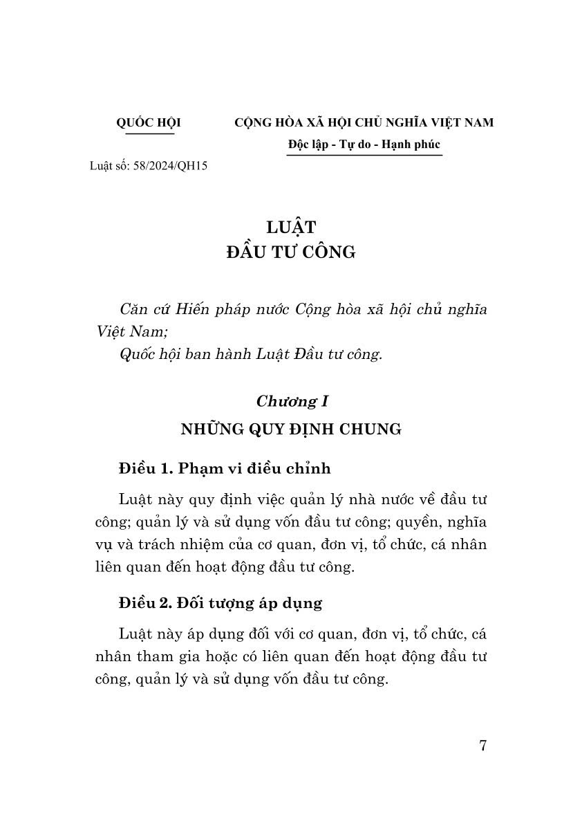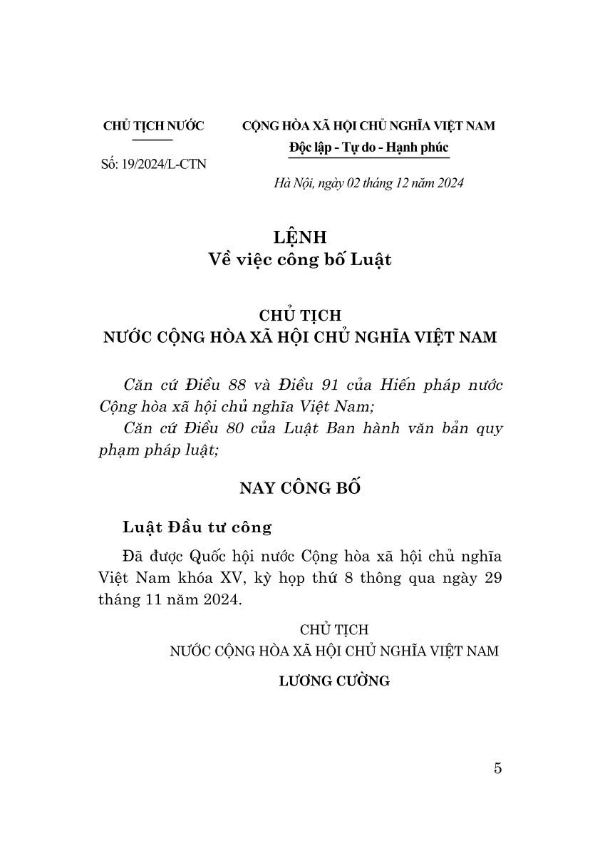 Luật Đầu tư công được Quốc hội khóa XV kỳ họp thứ 8 thông qua ngày 29/11/2024, có hiệu lực thi hành ngày 01/01/2025, thay thế Luật Đầu tư công năm 2019. Luật Đầu tư