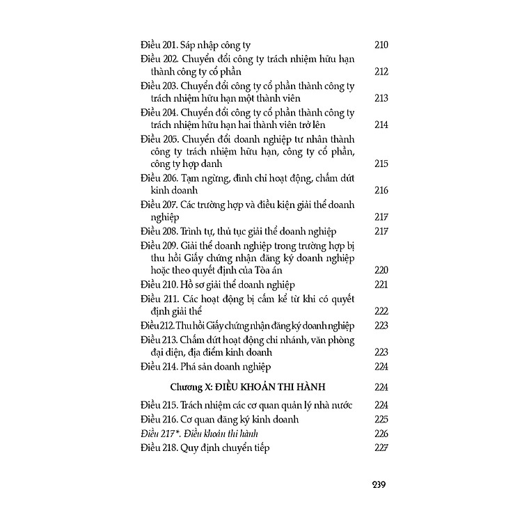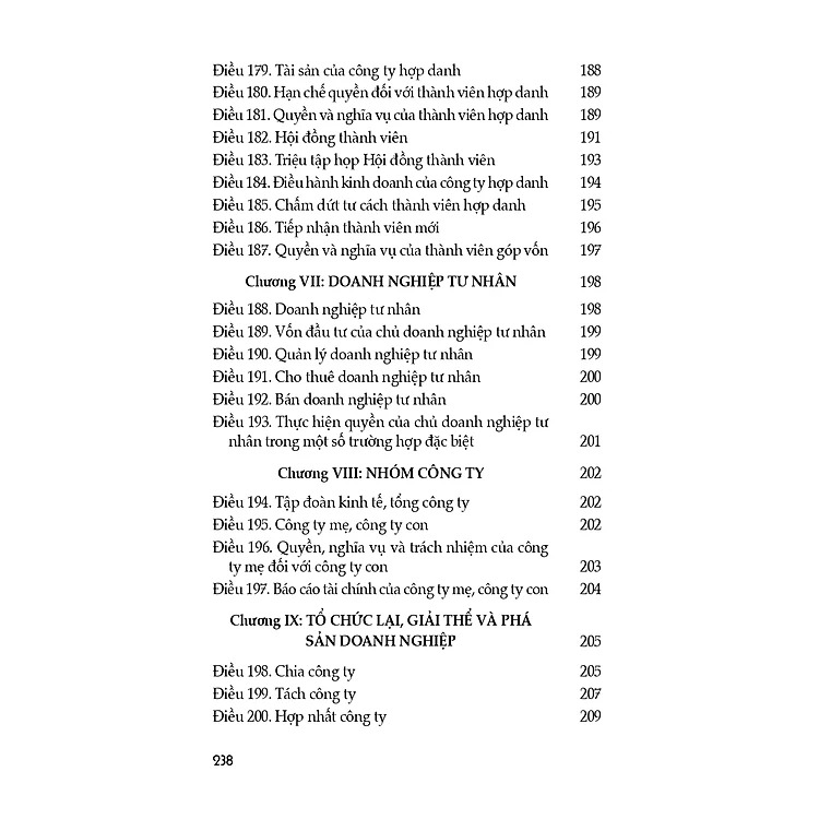Luật Doanh nghiệp (hiện hành) (sửa đổi, bổ sung năm 2022) gồm 10 chương, 218 điều, quy định về thành lập, tổ chức quản lý, tổ chức lại, giải thể và hoạt động có liên quan của doanh nghiệp, bao gồm công ty trách nhiệm hữu hạn, công ty cổ phần, công ty hợp danh và doanh nghiệp tư nhân; quy định về nhóm công ty. Luật Doanh nghiệp được Quốc hội khóa XIV kỳ họp thứ 9 thông qua ngày 17/6/2020, thay thế cho Luật Doanh nghiệp năm 2014.