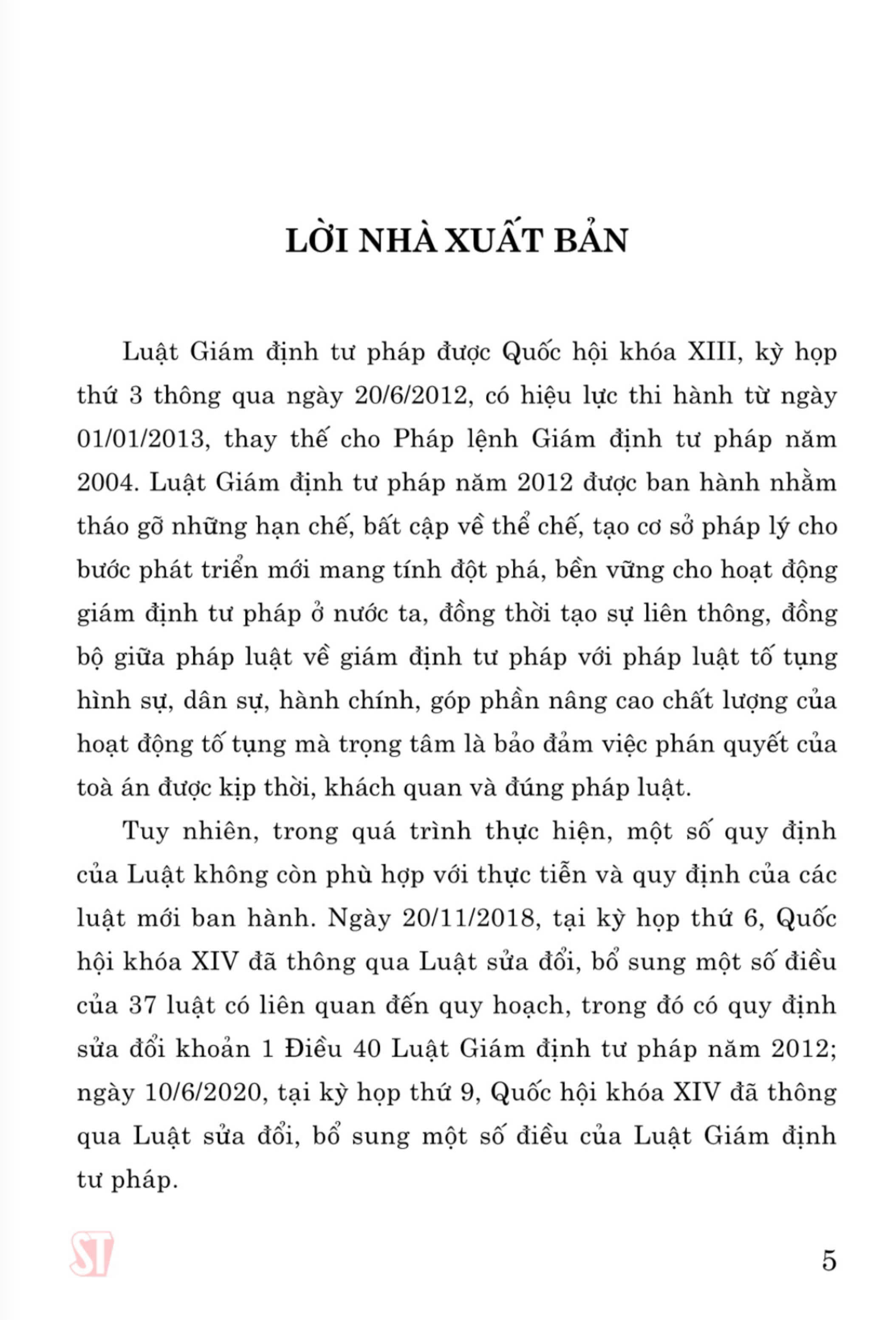 Luật Giám định tư pháp (hiện hành) (sửa đổi, bổ sung năm 2018, 2020) gồm 7 chương, 46 điều, quy định về: giám định viên tư pháp; tổ chức giám định tư pháp; người giám định tư pháp theo vụ việc, tổ chức giám định tư pháp theo vụ việc; hoạt động giám định tư pháp; chi phí giám định tư pháp, chế độ, chính sách trong hoạt động giám định tư pháp và trách nhiệm của cơ quan nhà nước đối với tổ chức, hoạt động giám định tư pháp. Luật Giám định tư pháp được Quốc hội khóa XIII, kỳ họp thứ 3 thông qua ngày 20/6/2012 và được sửa đổi, bổ sung vào các năm 2018, 2020. Cuốn sách Luật Giám định tư pháp (hiện hành) (sửa đổi, bổ sung năm 2018, 2020) là văn bản luật hợp nhất của Luật Giám định tư pháp năm 2012 và các nội dung của hai lần sửa đổi tạo thành một văn bản Luật Giám định tư pháp thống nhất hiện hành và mới nhất thuận tiện trong sử dụng tra cứu tham khảo.