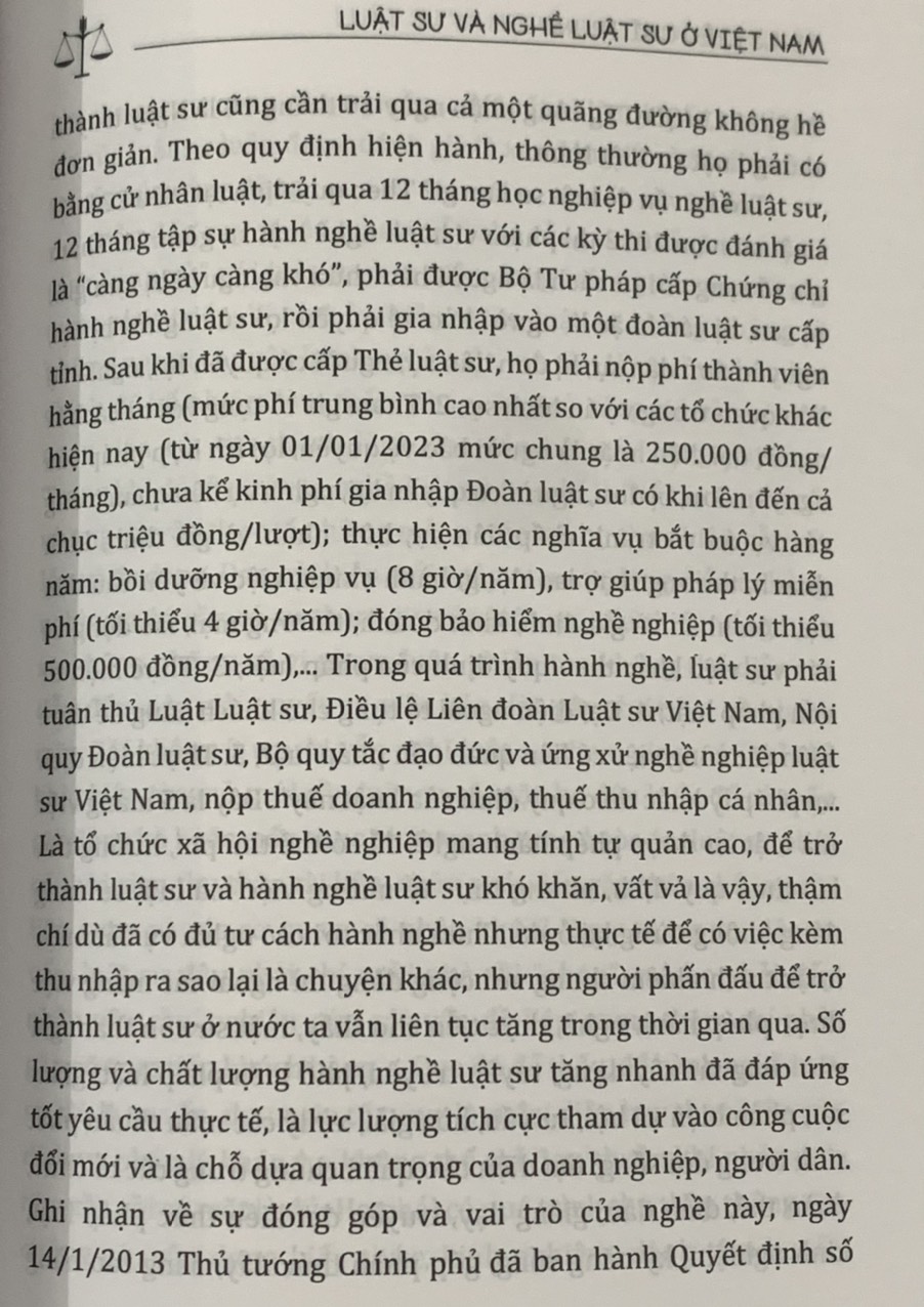 Vẫn biết, để phản ánh được hết các khía cạnh, công việc của nghề luật sư lúc này là điều không dễ, do đó “Luật sư và nghề luật sư ở Việt Nam” cũng khó tránh khỏi những hạn chế, thiếu sót nhất định. Nhưng bằng kinh nghiệm thực tế, cùng với việc dày công tìm tòi, nghiên cứu với cách thể hiện chân thực, dễ hiểu qua từng bài viết của tác giả, tin rằng cuốn sách sẽ mang đến cho người đọc nhiều thông tin tham khảo bổ ích, có giá trị về luật sư và nghề luật sư ở Việt Nam sau hơn một thế kỷ hoạt động.
