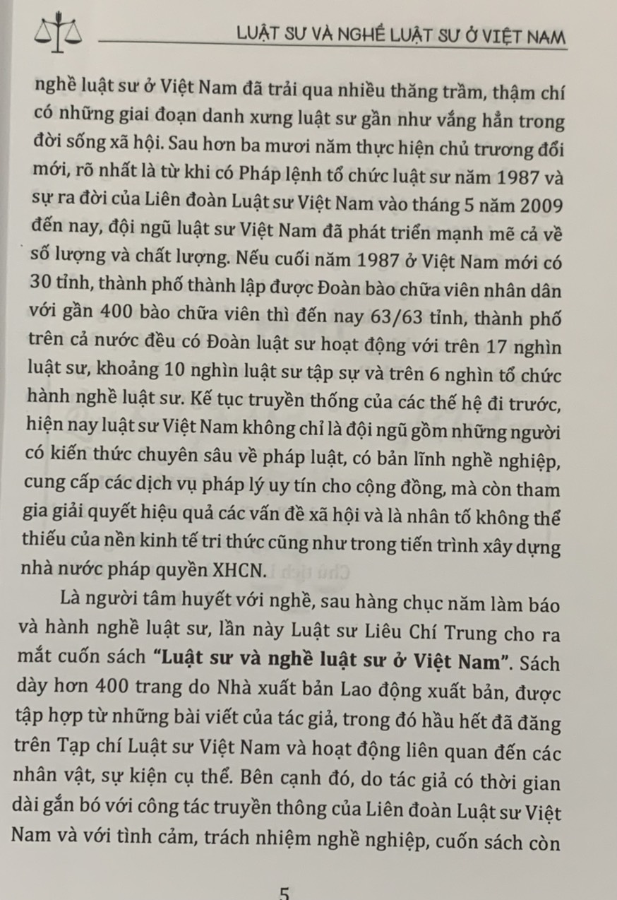 Là người tâm huyết với nghề, sau hàng chục năm làm báo và hành nghề luật sư, lần này Luật sư Liêu Chí Trung cho ra mắt cuốn sách “Luật sư và nghề luật sư ở Việt Nam”. Sách dày hơn 400 trang do Nhà xuất bản Lao động xuất bản, được tập hợp từ những bài viết của tác giả, trong đó hầu hết đã đăng trên Tạp chí Luật sư Việt Nam và hoạt động liên quan đến các nhân vật, sự kiện cụ thể. Bên cạnh đó, do tác giả có thời gian dài gắn bó với công tác truyền thông của Liên đoàn Luật sư Việt Nam và với tình cảm, trách nhiệm nghề nghiệp, cuốn sách còn cung cấp đến bạn đọc nhiều thông tin, tư liệu, hình ảnh quý về quá trình phát triển của nghề luật sư và hoạt động của Liên đoàn Luật sư Việt Nam.