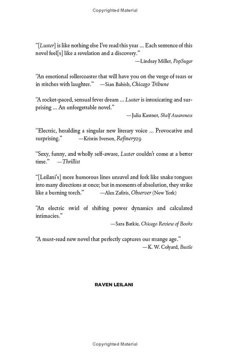 Irresistibly unruly and strikingly beautiful, razor-sharp and slyly comic, sexually charged and utterly absorbing, Raven Leilani’s Luster is a portrait of a young woman trying to make sense of her life―her hunger, her anger―in a tumultuous era. It is also a haunting, aching description of how hard it is to believe in your own talent, and the unexpected influences that bring us into ourselves along the way.