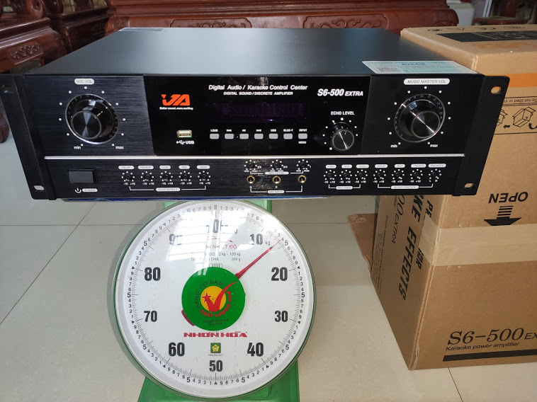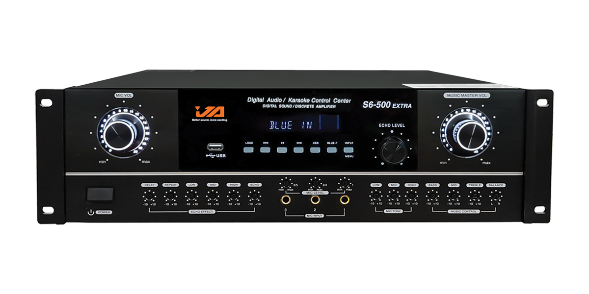 Main đẩy liền Vang JA S6-500 - Hàng Chính Hãng  MAIN LIỀN VANG S6 - 500 là dòng thiết bị âm thanh thông minh cho dàn combo Karaoke của bạn. Sản phẩm được tích hợp tính năng củaMAIN CÔNG SUẤT và VANG CƠ, là sự kết hợp giữa tính năng công suất với mạch chỉnh âm hiện đại của vang số cho ra âm thanh đầu ra hay và cực kỳ chất lượng. Với sự tiện ích 2 IN 1 của MAIN LIỀN VANG S6 - 500, giúp cho người tiêu dùng tiết kiêm được chi phí đầu tư cho bộ dàn Karaoke tại gia cũng như tiết kiệm được diện tích sử dụng.       Mặt trước của main liền vang: + Với thiết kế hình hộp chữ nhật, kích thước nhỏ gọn 530 x 500 x 220 mm (Rộng x Dài x Sâu) nên bạn dễ dàng sử dụng mà không chiếm nhiều diện tích khi tích hợp với Micro và loa,... + Toàn bộ linh kiện của thiết bị đều được bảo bọc bởi vỏ máy làm từ chất liệu hợp kim cao cấp, bề mặt sơn tông màu đen sang trọng, thời thượng nâng cao khả năng chống han gỉ, bảo vệ sản phẩm bền bỉ hơn. + Main có màn hình LCD ở giữa báo chế độ cường độ âm thanh với các nút vặn volume tắt mở nhạc, tắt mở mic, chỉnh lớn nhỏ Echo, phim bấm được thiết kế 2 bên góp phần tăng thêm tính thẩm mỹ của thiết bị. + Có nút bấm nhanh chuyển chế độ USB, Bluetooth cùng với nút INPUT có chức năng chuyển chế độ kết nối đầu vào trên S6 - 500. + Main có 5 ngõ kết nối micro: 3 cổng ở mặt trước, 2 cổng ở mặt sau.     Mặt sau của main liền vang: + Mặt sau của thiết bị là hệ thống các đường kết nối tín hiệu âm thanh vào và ra, các cổng kết nối thông dụng của thiết bị âm thanh và một số thông tin kỹ thuật cơ bản khác.   Bên cạnh đó, mặt sau của main còn có quạt tản nhiệt, giúp cho main không bị quá nóng khi hoạt động với cường độ cao. MAIN LIỀN VANG S6 - 500 được tích hợp bởi chip xử lý âm thanh, sau khi âm thanh được main liền vang S6 - 500 xử lý và khuếch đại ra lo chuyên nghiệp với bản nhạc đầy đủ âm sắc, hạn chế tối đa tạp âm, méo hay vỡ tiếng, chống hú rít. Với thiết kế 2 kênh riêng biệt, với mức công suất 500W/ 8Ω và 600W/ 4Ω cùng với 4 đường ra loa nên tăng khả năng kéo được 2 cặp loa Bass mang đến âm thanh sống động, chân thực. Được hỗ trợ 4 cổng kết nối Bluetooth-USB-Optical-COAXIAL-AUX1/AUX2 nên người dùng dễ dàng kết nối với các thiết bị như smartphone, laptop, tablet, tivi thông minh… mang đến trải nghiệm giải trí không giới hạn cho gia đình. Dễ dàng kết hợp với các dòng thiết bị âm thanh được trang bị hệ thống kết nối thông minh, linh hoạt thuận tiện cho quá trình phối ghép với các thiết bị như loa karaoke, loa sub, micro không dây...đem tới bộ dàn hiện đại và chuyên nghiệp nhất và đáp ứng tối đa nhu cầu karaoke, nghe nhạc tại gia hoặc các không gian mở ngoài trời.