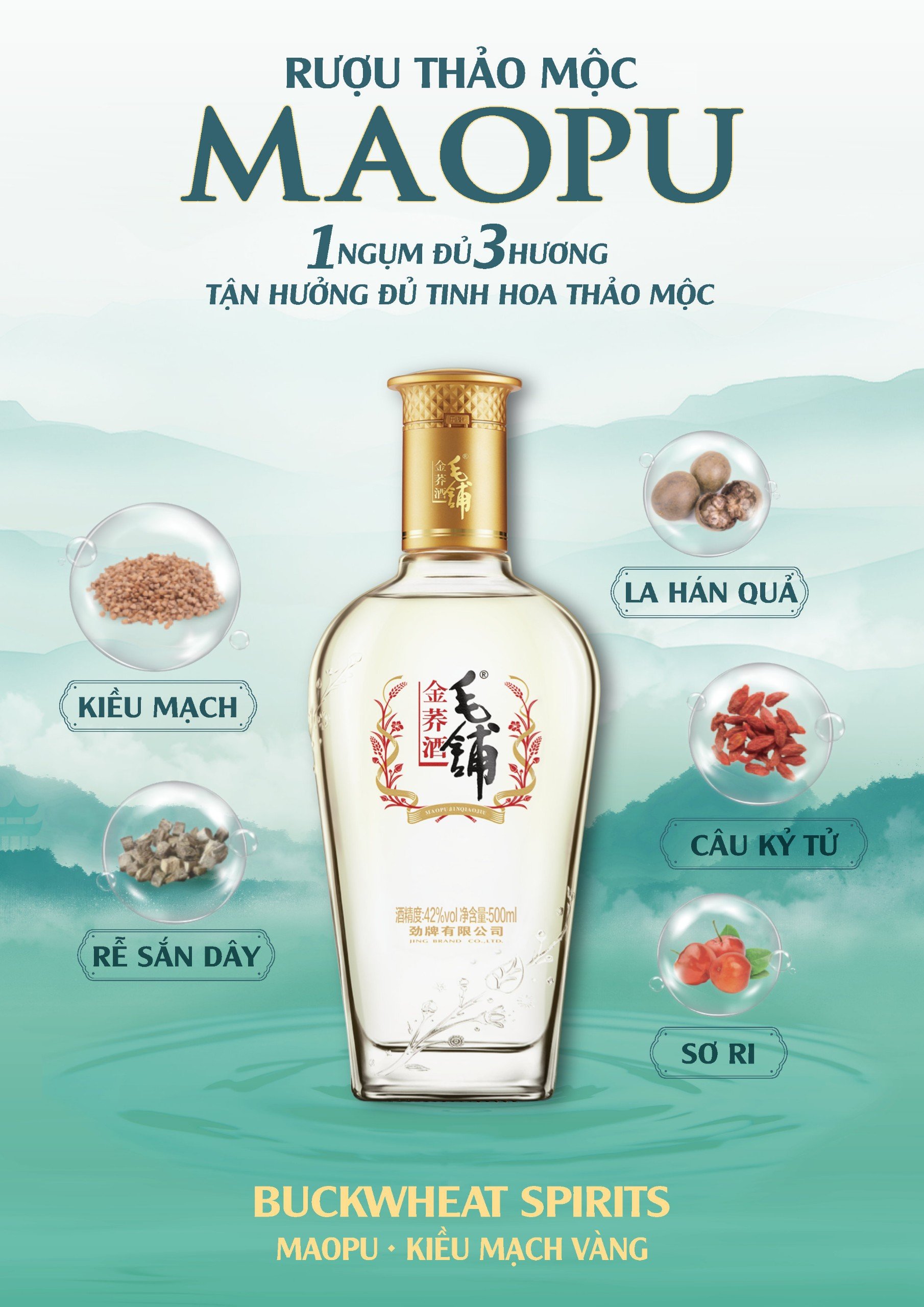 RƯỢU MAOPU KIỀU MẠCH THẢO MỘC 12 NĂM, GIÚP TRÁNG DƯƠNG, BỔ THẬN, TĂNG CƯỜNG HỆ MIỄN DỊCH - Độ cồn: 42% - Dung tích: 500ml/chai THÀNH PHẦN CHÍNH: Rượu trắng, nước suối tinh khiết và 5 loại thảo dược: Kiều Mạch Đắng, Rễ Sắn Dây, Câu Kỷ Tử, Sơ ri, Lá Tằm. CÔNG NGHỆ: - Sử dụng 2 công nghệ độc quyền: Hỗ trợ giảm lipid máu (được điều chế từ cây Mạch Đắng, một chế phẩm có tác dụng giảm lipid máu), giảm thiểu tổn thương gan (kỹ thuật sản xuất loại rượu trắng có thể chống lại tác dụng của cồn tới gan, giúp bảo vệ gan) HƯƠNG VỊ: - Là sự hòa quyện giữa 3 vị Thanh, Nồng, Đậu Tương. JING BRAND ĐÃ ĐẠT NHỮNG CHỨNG NHẬN QUỐC TẾ: Chứng nhận sản xuất thực phẩm tốt cho sức khỏe GMP; Chứng nhận thiết lập hệ thống quản lý an toàn thực phẩm HACCP; Chứng nhận Hệ thống quản lý chất lượng và môi trường ISO 14001; Chứng nhận Hệ thống quản lý chất lượng và môi trường ISO 9001; Báo cáo thử nghiệm của Phòng thí nghiệm Charles River ở Mỹ; Báo cáo thử nghiệm trong phòng thí nghiệm Systembolagets ở Thụy Điển. CÔNG DỤNG: Bảo vệ gan và tim mạch, ngăn ngừa ung thư Rutin và một số polyphenol khác có trong Kiều Mạch (sản phẩm chính