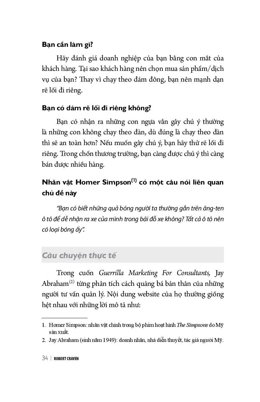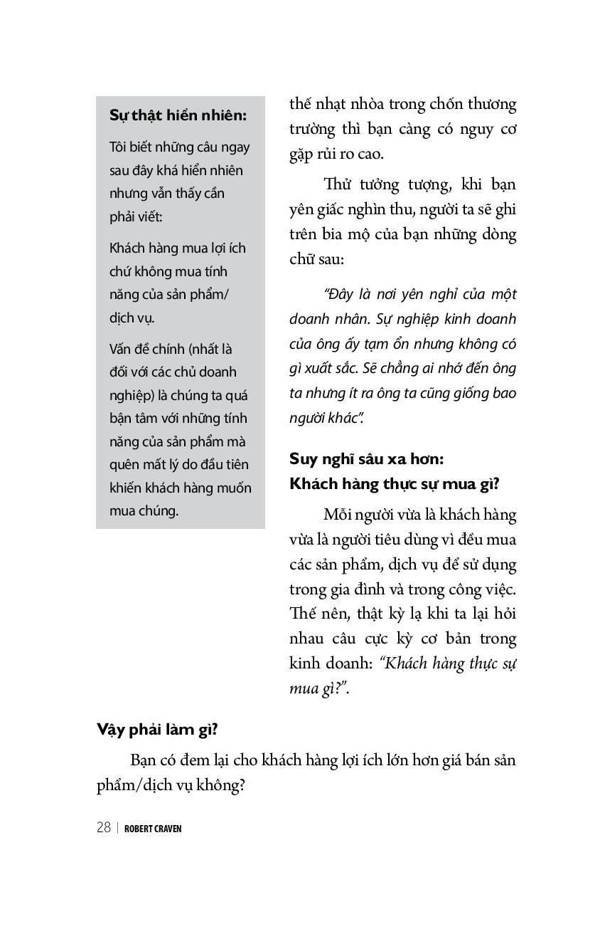 Vì không phải ai cũng có cơ hội tham gia các hội thảo của Robert Craven thế nên Robert Craven viết cuốn sách này để chia sẻ rộng rãi những kiến thức về marketing. Nội dung sách không hề rối rắm, không lý thuyết suông, bao gồm những bước đơn giản, thực tế mà bạn có thể áp dụng để tăng lợi nhuận và doanh số cho công ty.