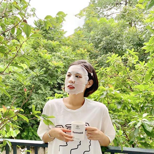 - Bước 2: Đắp mặt nạ giấy lên mặt, điều chỉnh để mặt nạ bám khít vào da