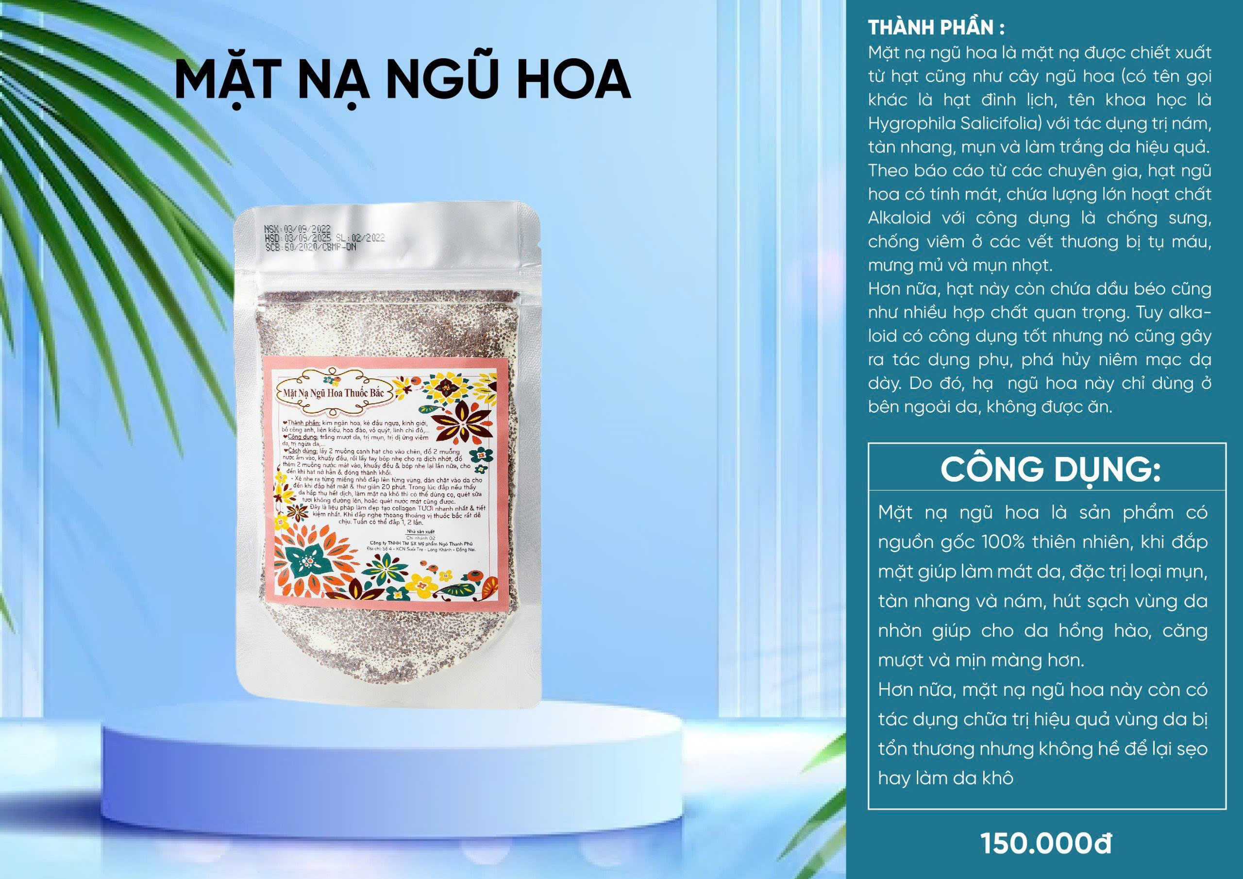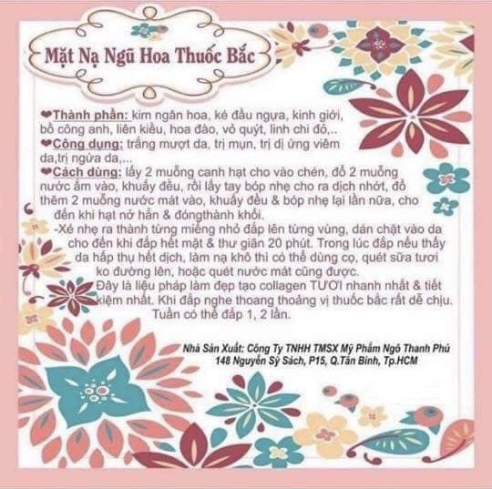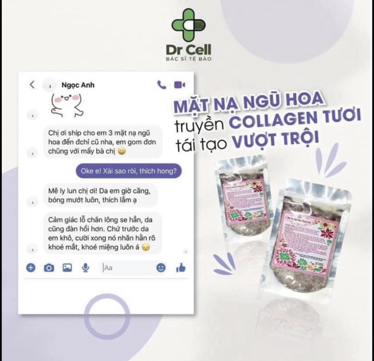 Mặt nạ ngũ hoa Dr Cell    THÀNH PHẦN: kim ngân hoa, ké đầu ngựa, kinh giới, bồ công anh, linh kiều, hoa đào, vỏ quýt, linh chi đỏ...    CÔNG DỤNG:  Làm mát da, hút đi mủ trong mụn.  Kiểm soát lượng dầu  Làm mờ vết thâm nám, tàn nhang,  Giúp da mặt căng bóng, trắng sáng, hết mụn nhọt, mụn cám trứng cá và mẩn ngứa do dị ứng. Sau khi đắp mặt nạ, cảm nhận đầu tiên là rất mát, da căng, mướt… Sau đó vùng da được chăm sóc trắng mịn lên. Lỗ chân lông được thu nhỏ lại giúp làn da trở nên mềm mại.    CÁCH DÙNG: Pha với sữa tươi không đường hoặc nước ấm Lấy hai thìa cafe bột nạ ngũ hoa cho vào chén, cho thêm 5 muỗng nước lọc vào khuấy đều lấy tay bóp nhẹ cho ra hạt nở ra. Bóp nhẹ thấy mềm dẻo và kết dính là được. Xé nhẹ ra từng miếng nhỏ đắp lên từng vùng và dàn đều ra cho đến khi đắp hết mặt và thư giãn 20 phút. Trong lúc đắp nếu thấy da hấp thụ hết dịch làm mặt nạ khô thì có thể dùng cọ quét sữa tươi không đường lên hoặc quét nước mát cũng được. Đây là liệu pháp làm đẹp tạo Collagen TƯƠI cho da nhanh nhất và tiết kiệm nhất. Khi đắp nghe thoang thoảng vị thuốc bắc rất dễ chịu. Tuần có thể đắp 1-2 lần 1 gói đắp hơn 10 lần