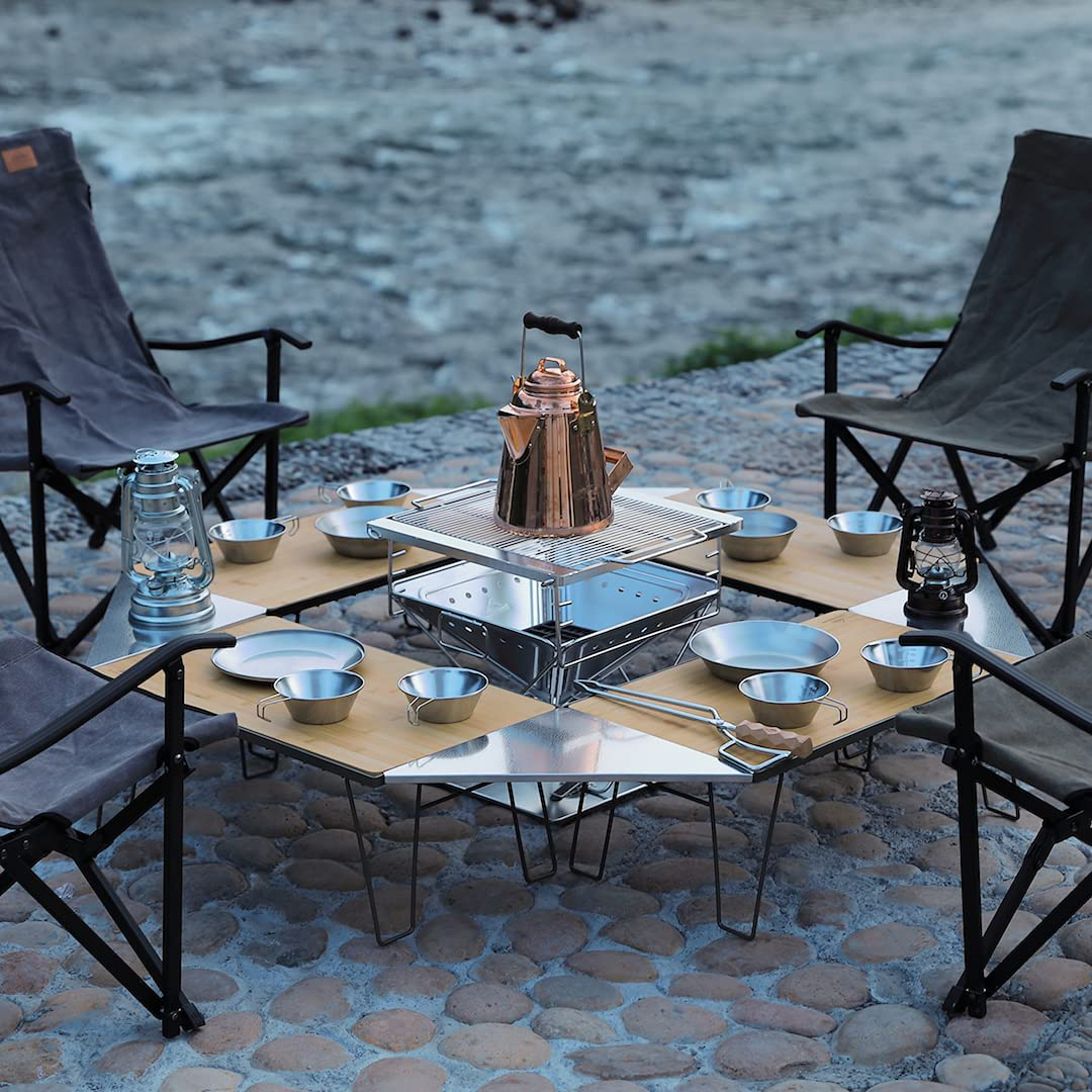 - Độ dày: 0.7mm Sử dụng ghép kệ để đồ dã ngoại làm thành một chiếc bàn quây Mặt tam giác Inox Campingmoon T-2306 cho phép bạn sử dụng hiệu quả các góc khi bố trí hai kệ với nhau. Bằng cách kết nối 4 kệ với 4 4 mặt tam giác này bạn sẽ có một chiếc bàn lò sưởi, hoặc một chiếc bàn quây, bạn có thể thoải mái bày trí theo phong cách của mình. Bề mặt của tấm trên cùng được hoàn thiện bằng quy trình dập nổi đặc biệt và được vát mép cẩn thận.