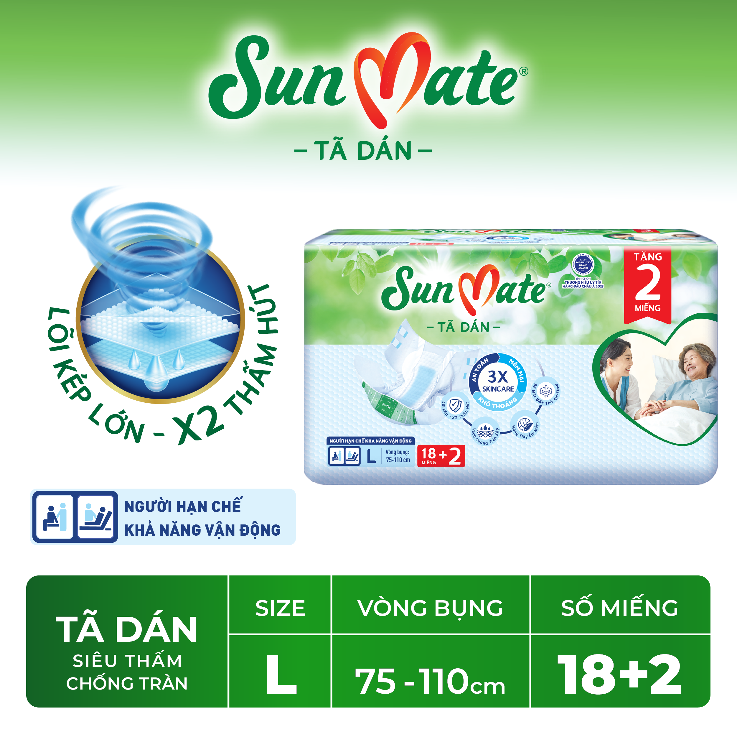 [Mẫu mới] Combo 2 Tã dán người lớn SunMate XA2 mới size L-18+2 miếng Giới thiệu - Tã dán người lớn SunMate XA2 là sản phẩm được thiết kế dành riêng cho người lớn, đặc biệt