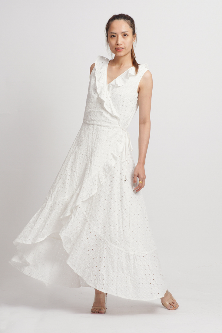 Maxi Cotton Cao Cấp Luna Llena, nền vải Lazer Cut độc đáo, tạo lỗ như ren, sang trọng, chất cotton dày dặn, thân trước đắp chéo, có thể tăng giảm eo. Phom rộng. Có lớp