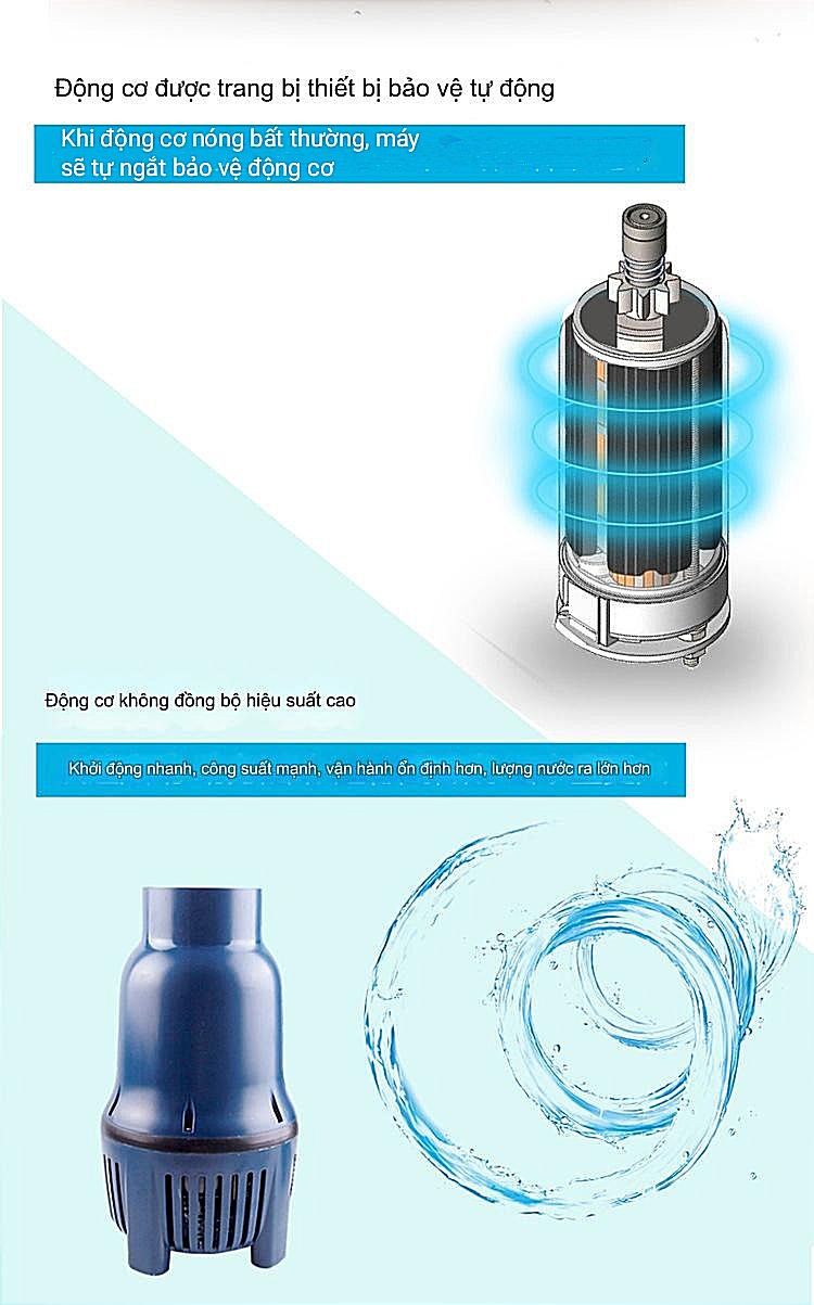 • Đầu bơm cao hơn, lưu lượng nước lớn hơn.
