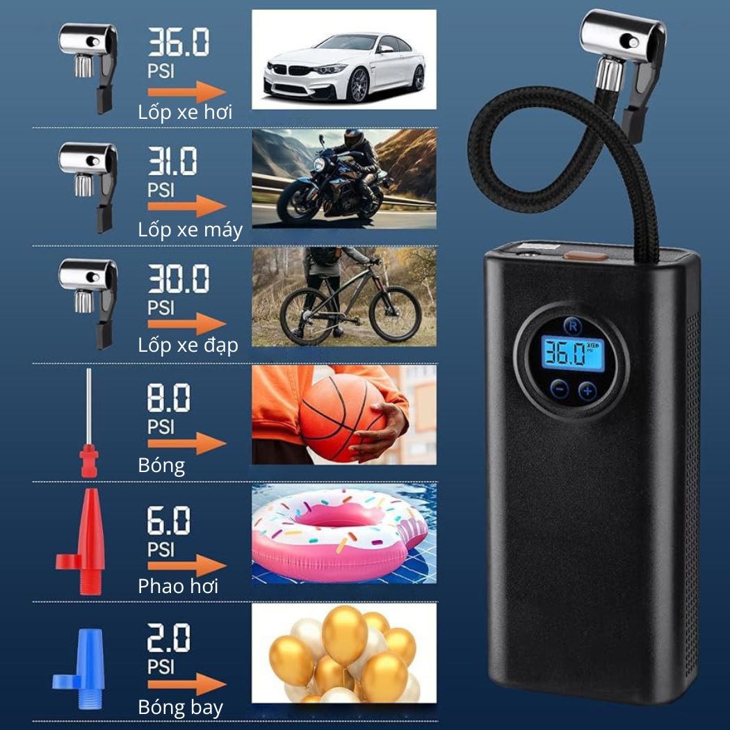 - Màn hình LED đôi hiển thị rõ ràng thông số áp suất - Cài đặt áp suất mong muốn dễ dàng, tự ngắt khi đạt mức - 4 chế độ bơm thông minh: xe hơi, xe