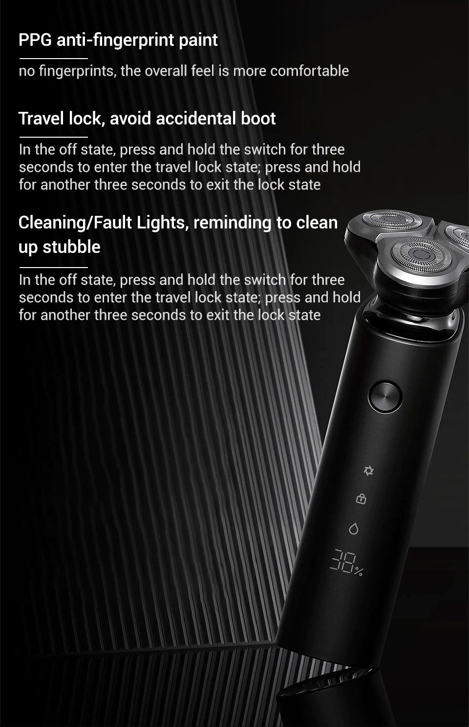 - Màu sắc: đen Máy cạo râu Mijia S500 là một thiết bị không thể thiếu cho các quý ông lịch lãm. Máy không những giúp bạn luôn giữ phong thái “mày râu nhẵn nhụi”, mà còn giúp tiết kiệm thời gian, công sức cho công việc chăm sóc vẻ ngoài của mình. Máy cạo râu Electric Shaver Mijia Xiaomi được cấu tạo từ hai bộ phận chính. Một là tay cầm có dạng trụ tròn và hai là phần dao cạo được thiết kế theo kiểu dáng như một con spinner hiện đại. Thiết kế khác lạ, độc đáo của chiếc máy cạo râu này không hề giống với bất cứ mẫu máy cạo râu thông thường nào. Lại nhỏ gọn (155 x 62mm) và sang trọng theo đẳng cấp quý ông nên rất thích hợp để bạn mang theo trong các chuyến công tác, du lịch hay chỉ đơn giản là sử dụng ở nhà. Tay cầm của máy cạo râu Electric Shaver Mijia Xiaomi được phủ một lớp bề mặt bằng hoạt chất PPG – PolyPropylene Glycol. Có tác dụng chống bám bẩn, chống bám vân tay và không làm xuống màu của thiết bị. Gần về cuối đuôi tay cầm là một dãy ký hiệu có tác dụng thông báo tình trạng hoạt động của thiết bị cho người dùng. Ký hiệu đầu tiên là chế độ quay của lưỡi dao. Tiếp theo là chế độ khóa an toàn, để thiết bị được bảo đảm không hoạt động khi không được khởi động. Tiếp theo là ký hiệu về chuẩn chống nước và cuối cùng là tình trạng pin trên thiết bị. Ngoài ra trên tay cầm còn có một nút nguồn để người dùng dễ dàng bấm mở. Máy cạo râu Electric Shaver Mijia Xiaomi được trang bị bộ dao thuộc hàng “cực phẩm”. Bao gồm 3 bộ dao đấu đầu 360o với nhau. Mỗi bộ dao được cấu tạo từ lưỡi dao kép giúp tăng 50% diện tích tiếp xúc với gương mặt người dùng. Nhờ vậy mà dao có thể linh động thích ứng với mọi đường nét phức tạp trên khuôn mặt người sử dụng và làm sạch mọi góc cạnh trên gương mặt chỉ với một lần cạo. Kết cấu của mỗi lưỡi dao trên máy cạo râu Electric Shaver Mijia Xiaomi được thiết kế 135 bánh răng và có khả năng xoay được 360o. Để nâng tính hiệu quả cho bộ lưỡi dao, nhà sản xuất đã nhập khẩu thép JPE từ Nhật Bản và bổ sung nguyên phụ liệu từ công ty SANDVIK Thụy Điển. Chính sự kết hợp tuyệt vời của hai tên tuổi lớn trong ngành sản xuất thép này đã đem đến bộ lưỡi dao có độ dày mỗi răng chỉ vỏn vẹn 0.08mm. Bộ lưỡi dao kép được thiết kế đối xứng các vòng cắt sẽ có tác dụng nâng bề mặt từng sợi râu và cắt gọn ghẽ không để lại dấu tích. Không những vậy, công nghệ gia công điện hóa ECM được ứng dụng trên thiết bị này cũng cho phép đem lại một vẻ ngoài hoàn thiện. Hoàn toàn không xuất hiện các gờ kim loại hay bất cứ mối hàn dư thừa nào. Máy cạo râu Electric Shaver Mijia Xiaomi sử dụng động cơ MABUCHI MOTOR 260 mạnh mẽ của Nhật Bản. Motor có momen xoắn lớn cùng tốc độ quay cao và hoạt động vô cùng ổn định. Việc sử dụng loại động cơ tân tiến này vào thiết bị sẽ giúp nâng tốc độ cắt lên đến 3.9m/s. Từ đó làm sạch nhanh chóng cho khuôn mặt của bạn. Máy cạo râu Electric Shaver Mijia Xiaomi được trang bị chuẩn chống thấm nước IPX7. Giúp bạn dễ dàng vệ sinh cho bộ dao mà không gây ảnh hưởng đến động cơ và linh kiện bên trong. Tuy nhiên khi sử dụng người dùng cần lưu ý không nên tắm, gội đầu và cạo râu cùng lúc vì lúc này da đang rất mỏng và nhạy cảm nên rất dễ bị kích thích gây tấy đỏ tại vị trí cạo. Thiết bị máy cạo râu lần này của Xiaomi cũng sử dụng pin lithium làm nguồn cung năng lượng chính. Khi pin yếu bạn có thể sạc nhanh chóng cho thiết bị bằng bộ sạc USB trong 5 phút. Trong khi ở chế độ sạc thường bạn chỉ cần mất 2 giờ để sạc từ nguồn điện máy tính hay thiết bị di động. Sau mỗi lần sạc đầy, pin có khả năng dùng để cạo 30 lần trong vòng 1 tiếng. Từ đó giúp bạn đánh bay mọi lo lắng về vẻ ngoài của mình trong nháy mắt.
