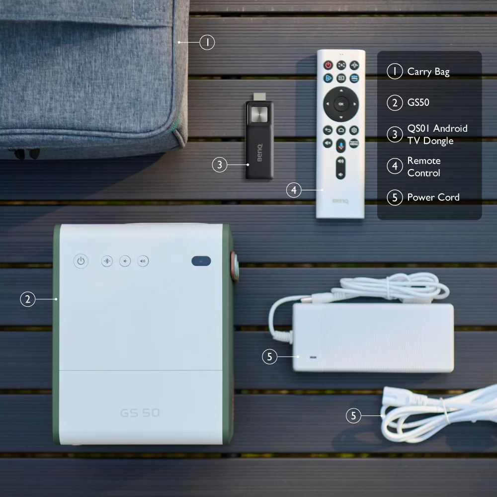 - Cổng kết nối đa dạng của máy hỗ trợ nhiều thiết bị khác nhau, giúp bạn dễ dàng kết nối và trình chiếu từ mọi nguồn. Review tính năng máy chiếu BenQ GS50 Thiết kế sang trọng, bền bỉ GS50 của BenQ được thiết kế để đảm bảo độ bền nhẹ, phù hợp với lối sống năng động và bền bỉ của người dùng. Thiết kế công thái học của nó mang lại sự thoải mái và tiện ích trong mọi tình huống sử dụng. GS50 của BenQ được bảo vệ bằng màng chống tia nước, giúp máy chiếu chịu được tác động của tia sáng truyền đi một cách an toàn và đáng tin cậy. Âm thanh sống động Mang đến trải nghiệm điện ảnh sống động không chỉ trong nhà mà còn cả khi bạn ở ngoài trời, GS50 của BenQ thực sự ấn tượng. Với hệ thống âm thanh tích hợp 2.1 kênh, gồm loa tweeter tầm trung kép 5W và loa trầm mạnh mẽ 10W, GS50 không chỉ là máy chiếu mà còn là một bộ loa Bluetooth đỉnh cao. Điều này mang đến âm thanh sâu lắng và phong phú, với âm trầm mạnh mẽ từ loa trầm chuyên dụng. Bằng cách kết nối với thiết bị Bluetooth, GS50 không chỉ chiếu phim mà còn phát nhạc, tạo ra một không gian giải trí hoàn hảo và tiện lợi. Tận hưởng trải nghiệm rạp chiếu phim tại bất kỳ đâu, GS50 thực sự là một máy chiếu di động đa chức năng, mang lại sự tiện ích và thoải mái cho người dùng. Màu sắc tối ưu cho ngoài trời Được hỗ trợ bởi công nghệ BenQ CinematicColor, GS50 không chỉ tái tạo màu sắc chân thực mà còn gợi lên những cảm xúc sâu sắc nhất của bạn, để lại ấn tượng lâu dài. Với độ sáng đáng kể lên đến 500 lumens và độ phân giải Full HD 1080p, GS50 thể hiện độ tương phản sống động và tái hiện những cảnh sống động như thật trong cả phim ảnh và nội dung phát trực tuyến. Độ sáng cân bằng GS50 không chỉ tăng cường chi tiết và độ tương phản trong cảnh sáng và bóng tối, mà còn điều chỉnh tự động độ sáng dựa trên điều kiện ánh sáng xung quanh. Điều khiển từ xa từ ứng dụng điện thoại thông minh Với ứng dụng BenQ Smart Control, bạn có thể điều khiển GS50 từ điện thoại của mình một cách dễ dàng và thuận tiện, không gì có thể ngăn cản trải nghiệm giải trí của bạn. Độ trễ thấp GS50 không chỉ cung cấp độ trễ đầu vào thấp nhất trong số tất cả các máy chiếu di động, với chỉ 22,7 mili giây cho 1080p@60Hz ở Chế độ trò chơi, mà còn đảm bảo rằng độ trễ đầu vào chỉ tăng nhẹ khi bạn bật chức năng keystone. Thời lượng pin cao Thưởng thức thời gian xem phim không giới hạn lên đến 150 phút bất kể bạn ở đâu, nhờ vào thời lượng pin của GS50.Thời lượng pin có thể thay đổi tùy theo loại nội dung, nguồn phương tiện hoặc cài đặt máy chiếu. Tiện lợi Bộ phụ kiện đa năng đi kèm với GS50 bao gồm một hộp lưu trữ linh hoạt, có thể chứa và phân vùng dành cho điện thoại di động, sạc dự phòng, bảng điều khiển trò chơi cầm tay và nhiều thiết bị khác. Tất cả được thiết kế để dễ dàng mang theo, giúp bạn tổ chức và bảo quản thiết bị một cách tiện lợi. Khi di chuyển, hãy đảm bảo đặt máy chiếu vào túi đựng hoặc cầm máy bằng hai tay một cách chắc chắn và đúng cách, giúp bảo vệ và duy trì hiệu suất của thiết bị trong suốt hành trình. Khoảng cách xem và kích thước màn hình tối ưu Khoảng cách chiếu chỉ khoảng 7 feet cho màn hình lớn 80”. Để có trải nghiệm xem lý tưởng, chúng tôi khuyên dùng kích thước màn hình trong khoảng từ 80” đến 100”. Cổng kết nối đa dạng GS50 kết nối bạn với mọi loại hình giải trí thông qua các đầu vào phổ biến như HDMI 2.0, Type-A cho đầu đọc USB, và USB-C . Điều này cho phép bạn dễ dàng kết nối với các thiết bị khác nhau và trải nghiệm giải trí một cách linh hoạt và thuận tiện. Thông số kỹ thuật máy chiếu BenQ GS50
