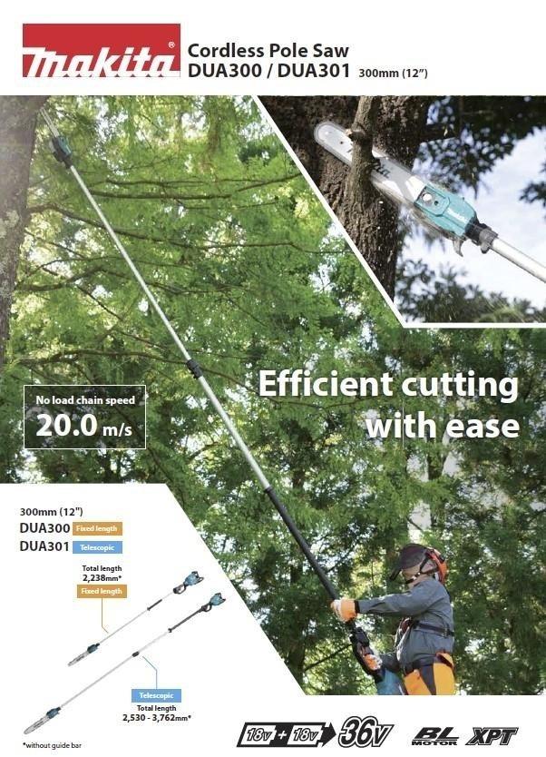 Trong hộp có: Máy Makita DUA301ZB, Lam 12, vỏ xích, bộ xích, cờ lê 13-16, dầu, dây đeo vai, kính bảo hộ. Máy chưa bao gồm pin và sạc.