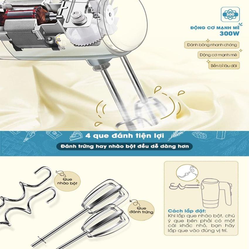 Động cơ 375W êm ái nhưng mạnh mẽ 4 mức tốc độ. Thêm nút quay nhanh Thích hợp sử dụng bằng tay phải hoặc trái Dễ vệ sinh Có nút nhả cho thanh đánh trứng