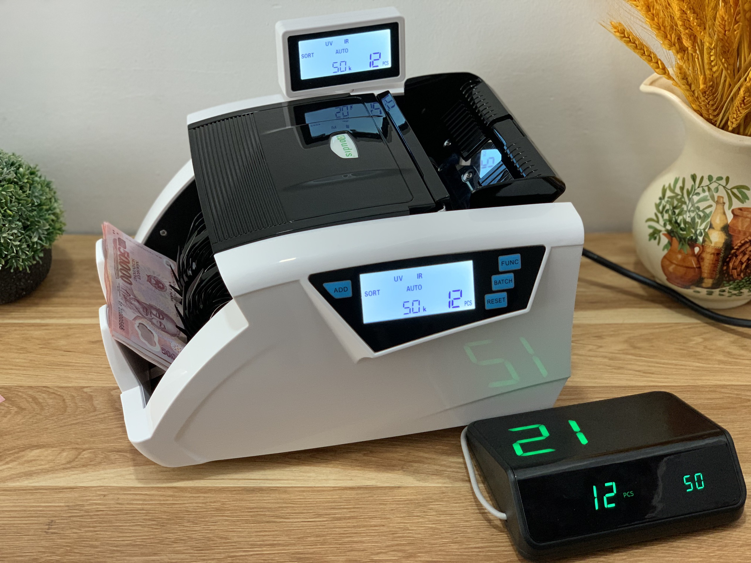 2 cặp mắt đếm riêng biệt đảm bảo độ chính xác khi đếm số tiền lớn đặc biệt là chức năng cho ra tổng giá trị số tiền vừa đếm đồng thời có thể phát hiện tiền gi.ả ở chế độ tổng tiền (Total) mà ở những dòng máy tương đương khác không có.