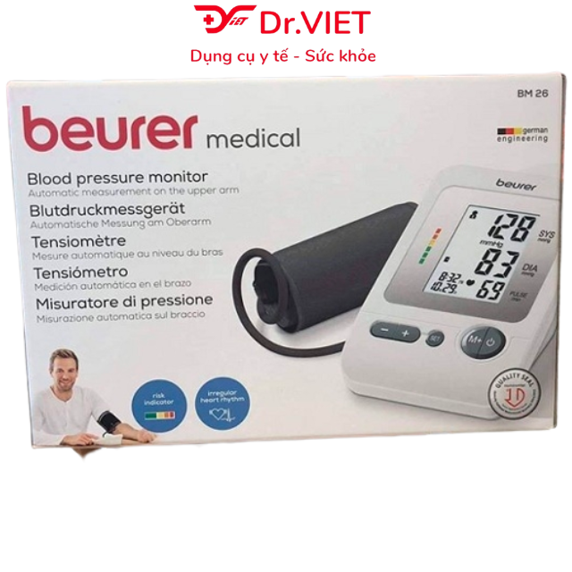 • Thiết bị tự động tắt sau 3 phút. Hãy chờ thêm 5 phút để sử dụng cho lần đo tiếp theo Thông số kỹ thuật: -Thương hiệu: Beurer - Đức -Phương pháp đo: Đo huyết áp dao động  -Mã sản phẩm: BM26. -Dải đo nhịp tim: 40 - 180 nhịp/phút -Chất liệu vỏ máy: Nhựa cao cấp. -Pin 4 pin AA -Kích thước (DxRxC): 155 x 110 x 70 mm. -Trọng lượng: Khoảng 395g (không tính pin) -Màn hình: LCD -Điện thế pin: 6V -Bộ nhớ: 4 x 30 kết quả -Chu vi vòng bít: 22 - 35 cm. -Tự động tắt máy khi không sử dụng. -Bảo hành 36 tháng -Sản xuất tại: Trung Quốc. Trọn bộ sản phẩm: 01 Máy đo huyết áp bắp tay, 4 pin AA, Túi đựng, Hướng dẫn sử dụng. LƯU Ý -Không nên đo sau khi bạn vừa ăn uống, hút thuốc hoặc tập thể dục. -Sản phẩm máy đo huyết áp bắp tay Beurer BM26 cho kết quả đo chính xác nhất trong điều kiện nhiệt độ 10-40 độ C -Nên lặp lại việc đo sẽ cho bạn giá trị đo chính xác nhất. -Không đo ở trên cổ tay có vết thương. -Không đặt vật nặng lên trên máy.