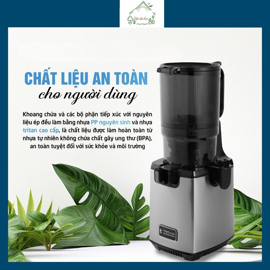 - Chất liệu tuyệt đối an toàn cho người dùng Khoang chứa và các bộ phận tiếp xúc với nguyên liệu ép đều làm bằng nhựa Tritan cao cấp, là chất liệu được làm hoàn toàn từ nhựa tự nhiên không chứa chất gây ung thư (BPA), an toàn tuyệt đối với sức khỏe và môi trường.